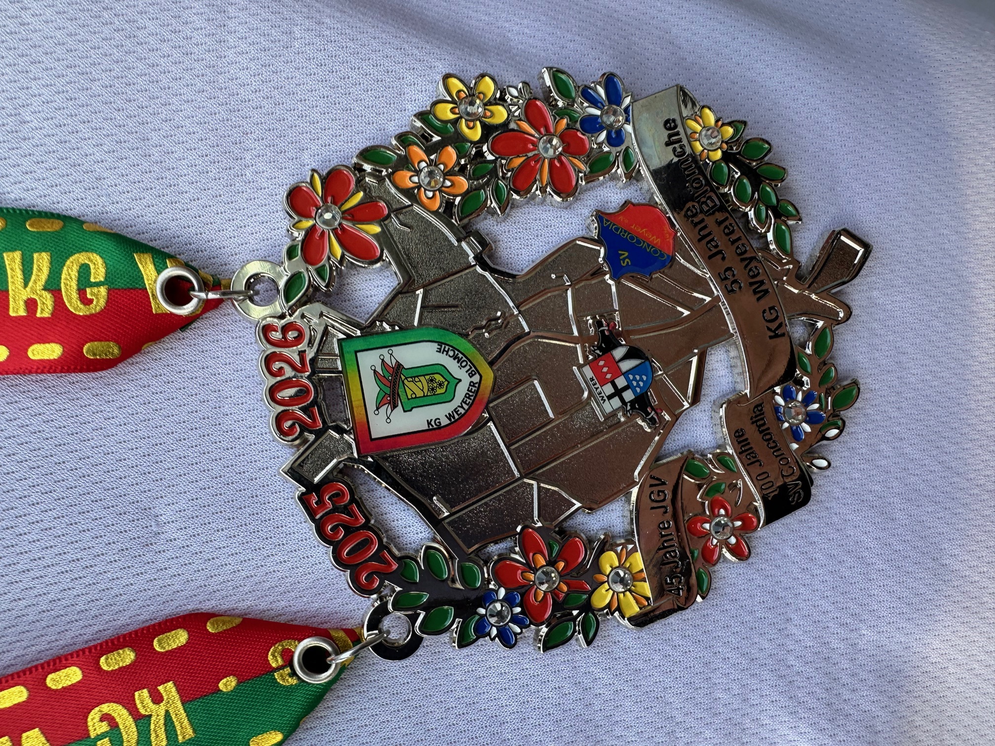 Das Jubiläum der Blömche fällt in eine ganz besondere Zeit: Auch andere Weyerer Vereine können bald runde Geburtstage feiern. 2026 wird der Junggesellenverein „Weyerer Wildschweine“ 45 Jahre alt, und der Sportverein SV Concordia Weyer begeht sogar sein 100-jähriges Bestehen. Diese Verbundenheit spiegelt sich auch im diesjährigen Orden der KG wider – dort sind die Wappen aller drei Jubiläumsvereine vereint und im Straßenbild von Weyer dargestellt.