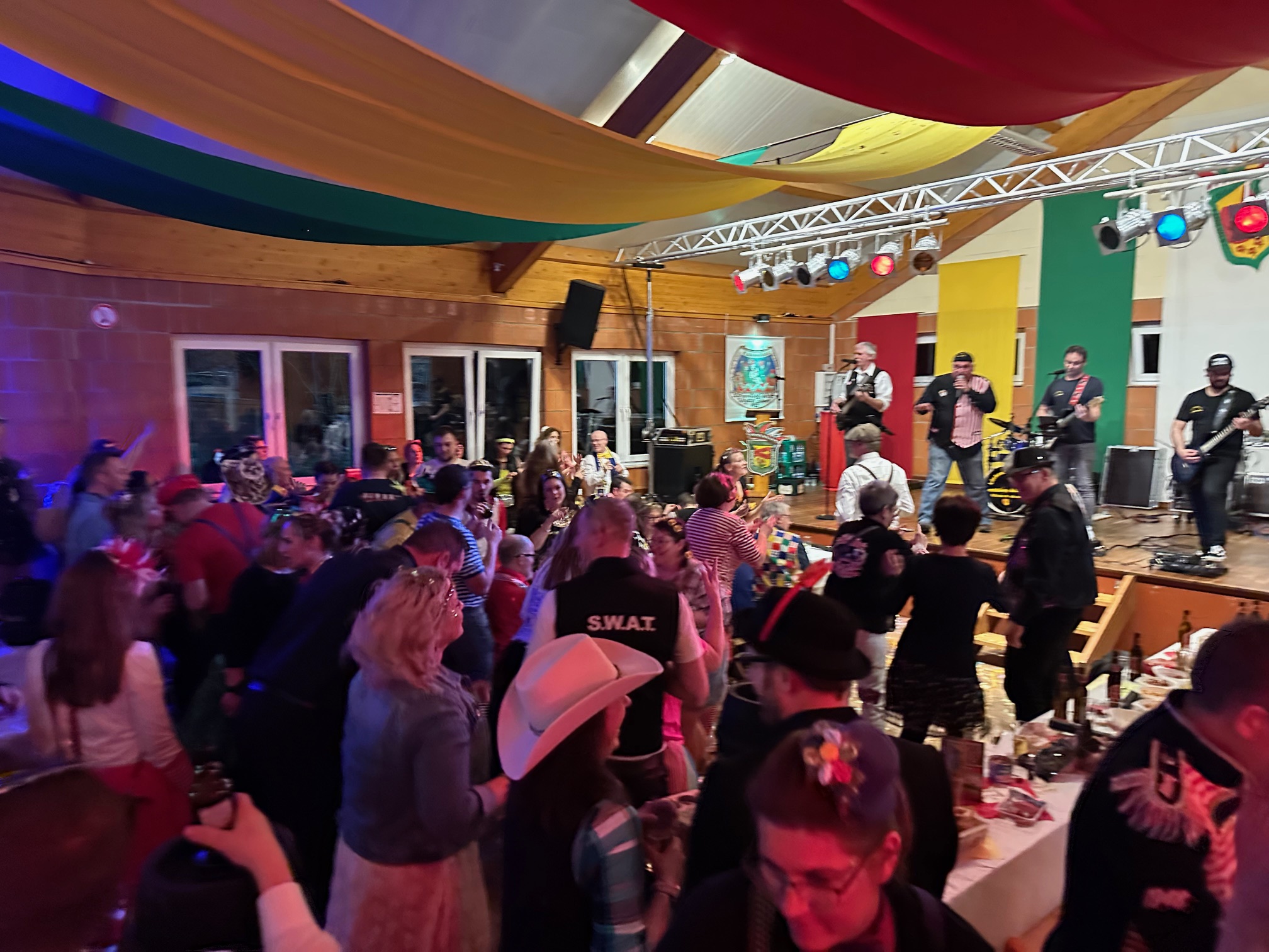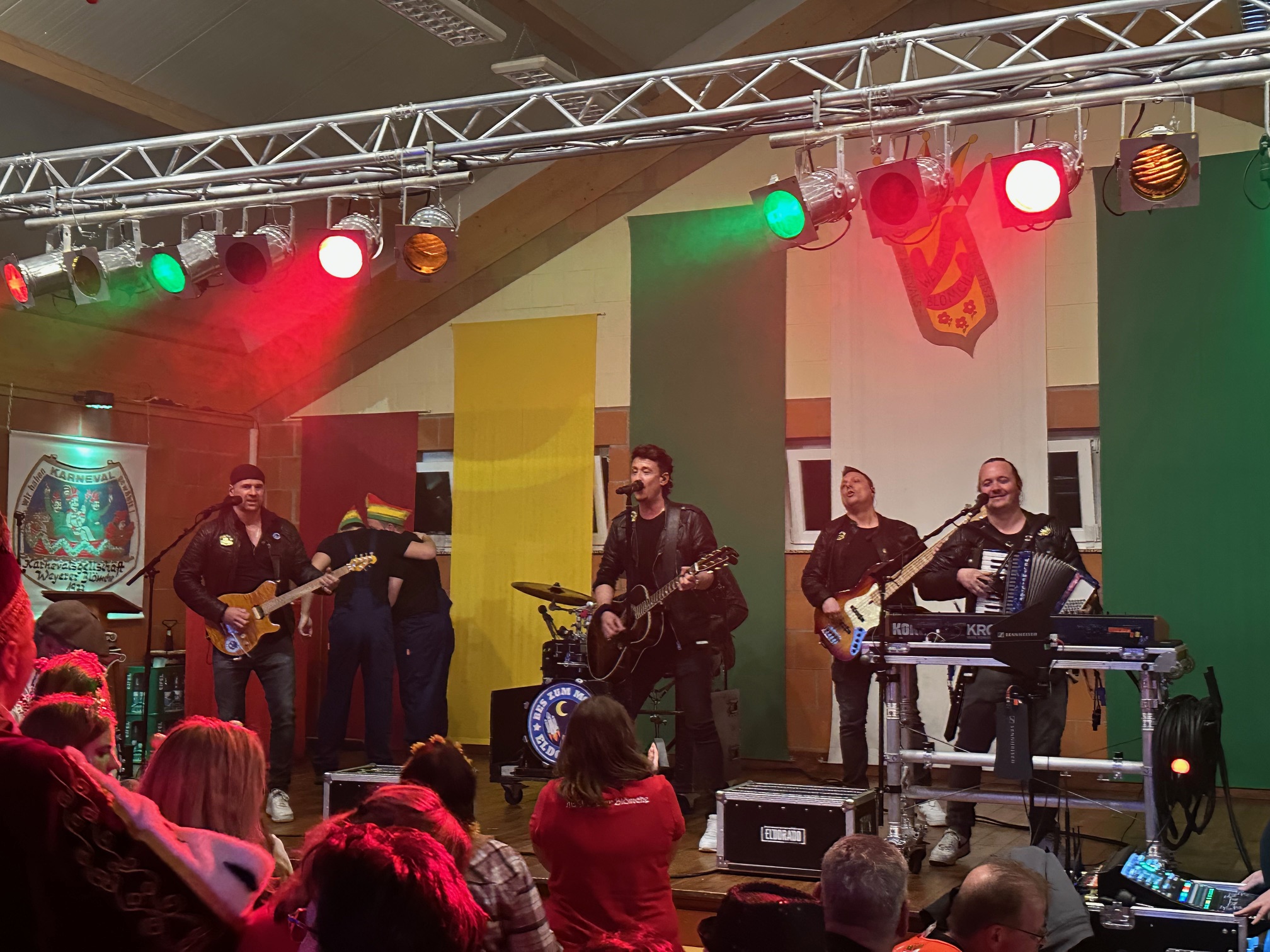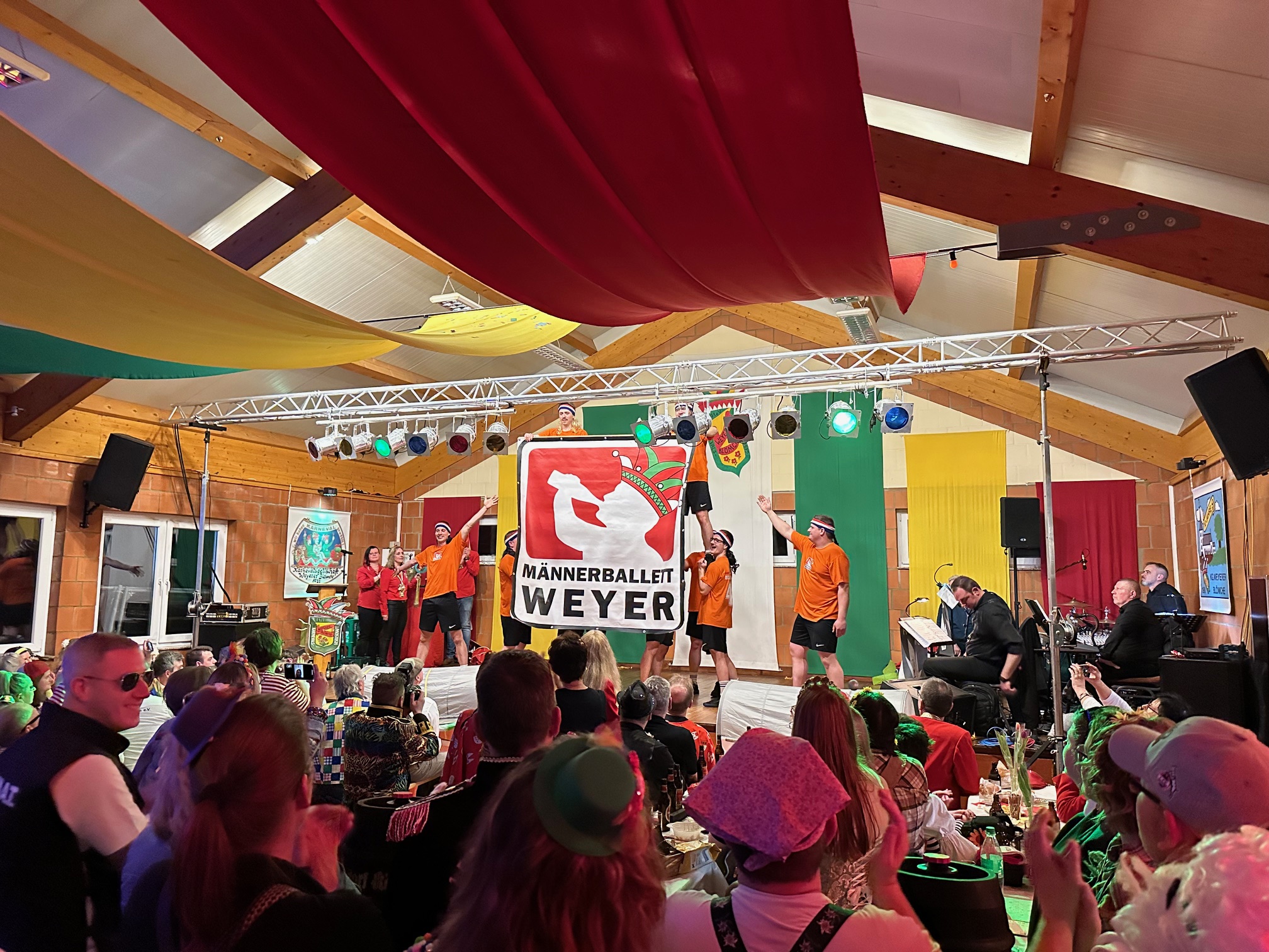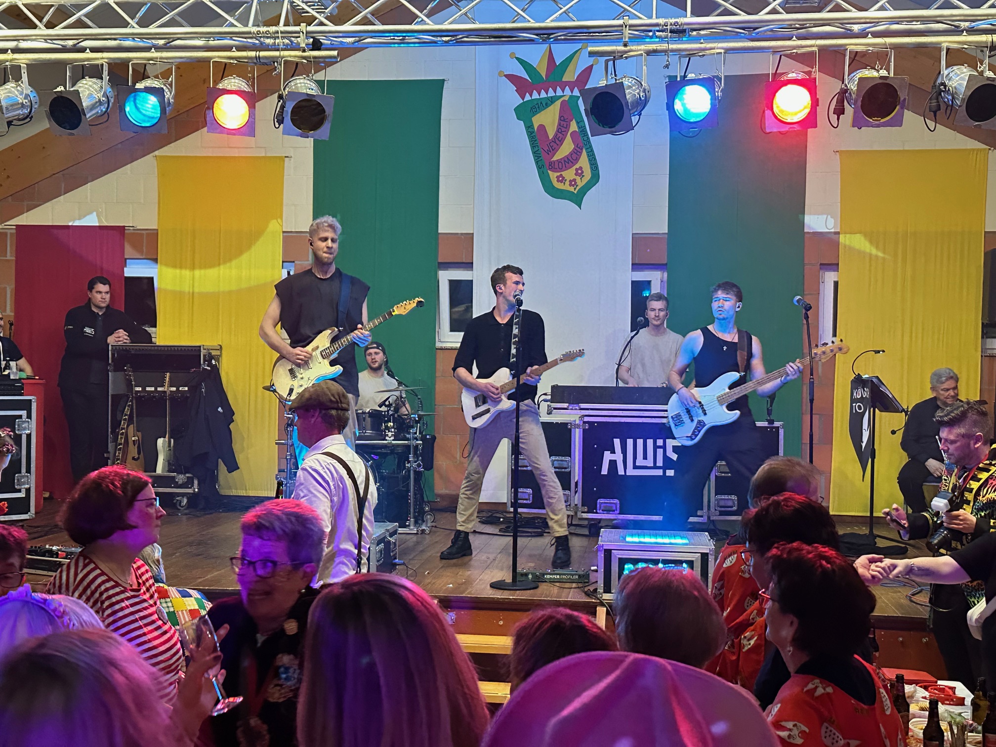 Und dann folgte ein absoluter Höhepunkt: Die Kölner Band ALUIS betrat die Bühne! Alte Bekannte, könnte man sagen, doch in Weyer sind es schon Freunde. Bereits im letzten Jahr hatten sie mit einem legendären Auftritt für Furore gesorgt, und auch diesmal wurde es nicht anders. Auf den Bänken und Tischen feierten die Jecken ausgelassen zu den kölschen Klängen. Ein unvergesslicher Moment war, als sich die gesamte Halle auf Kommando niederkniend vorbereitete, nur um dann gemeinsam in eine ekstatische Party zu explodieren – Gänsehaut pur!