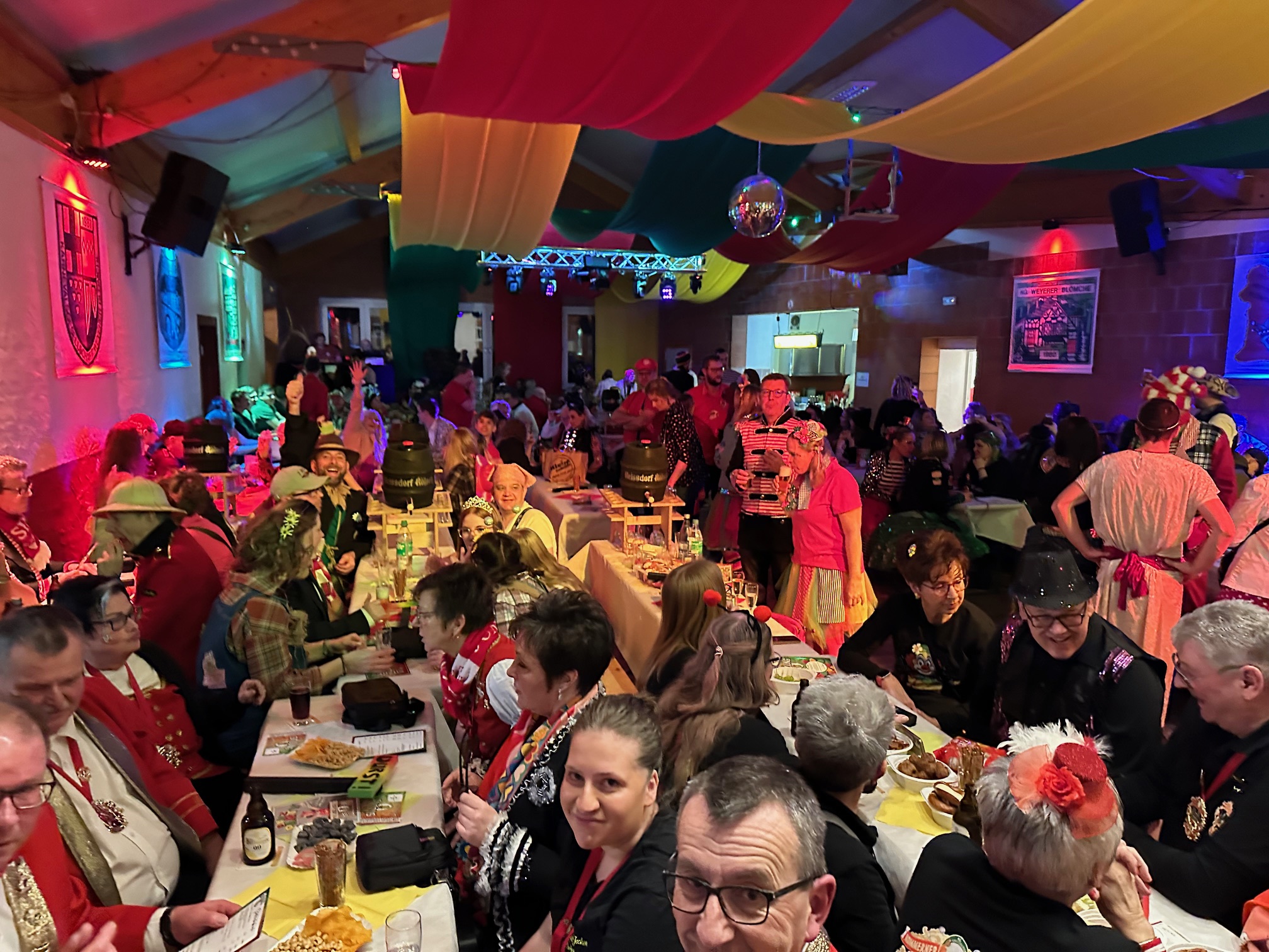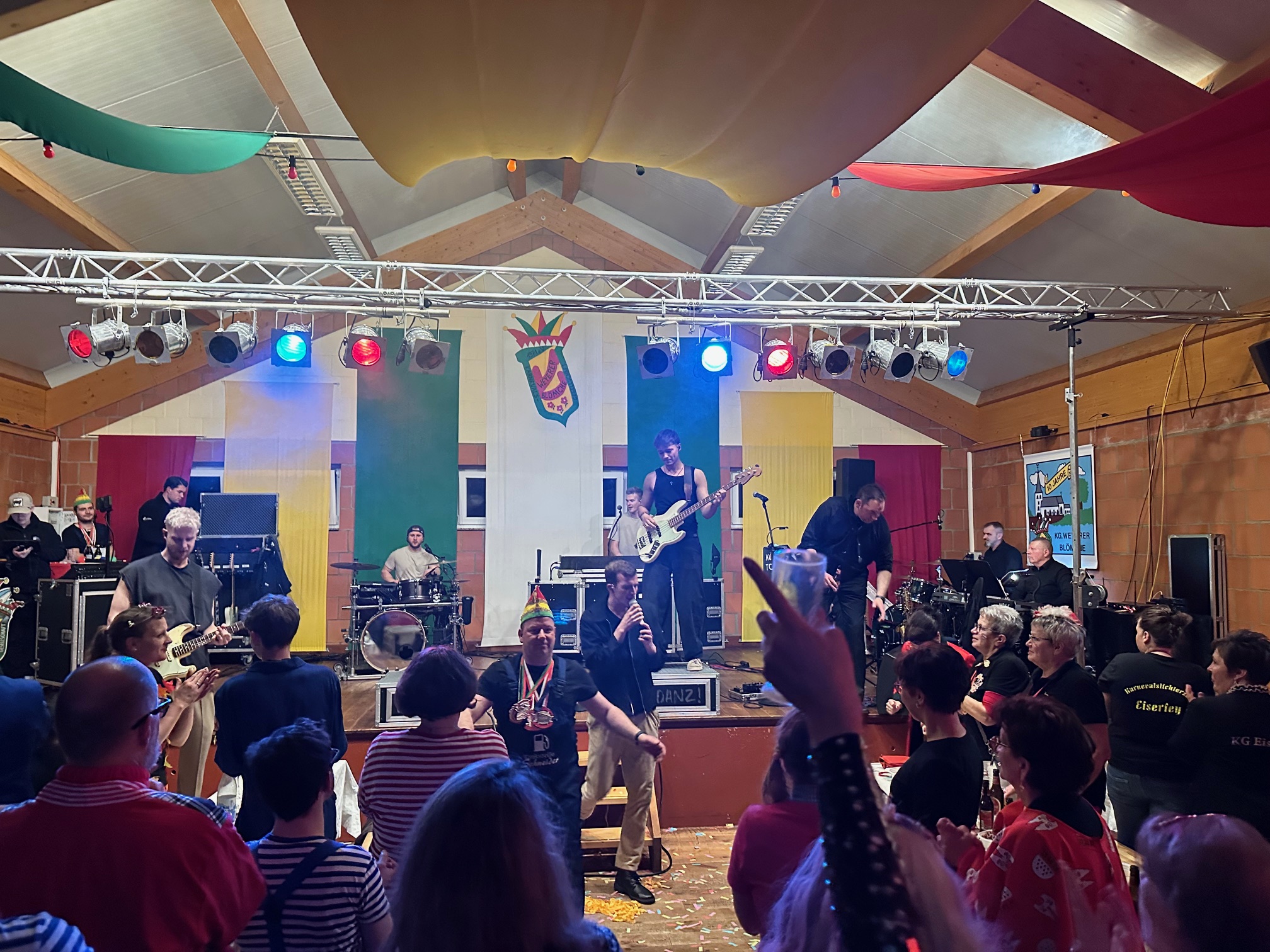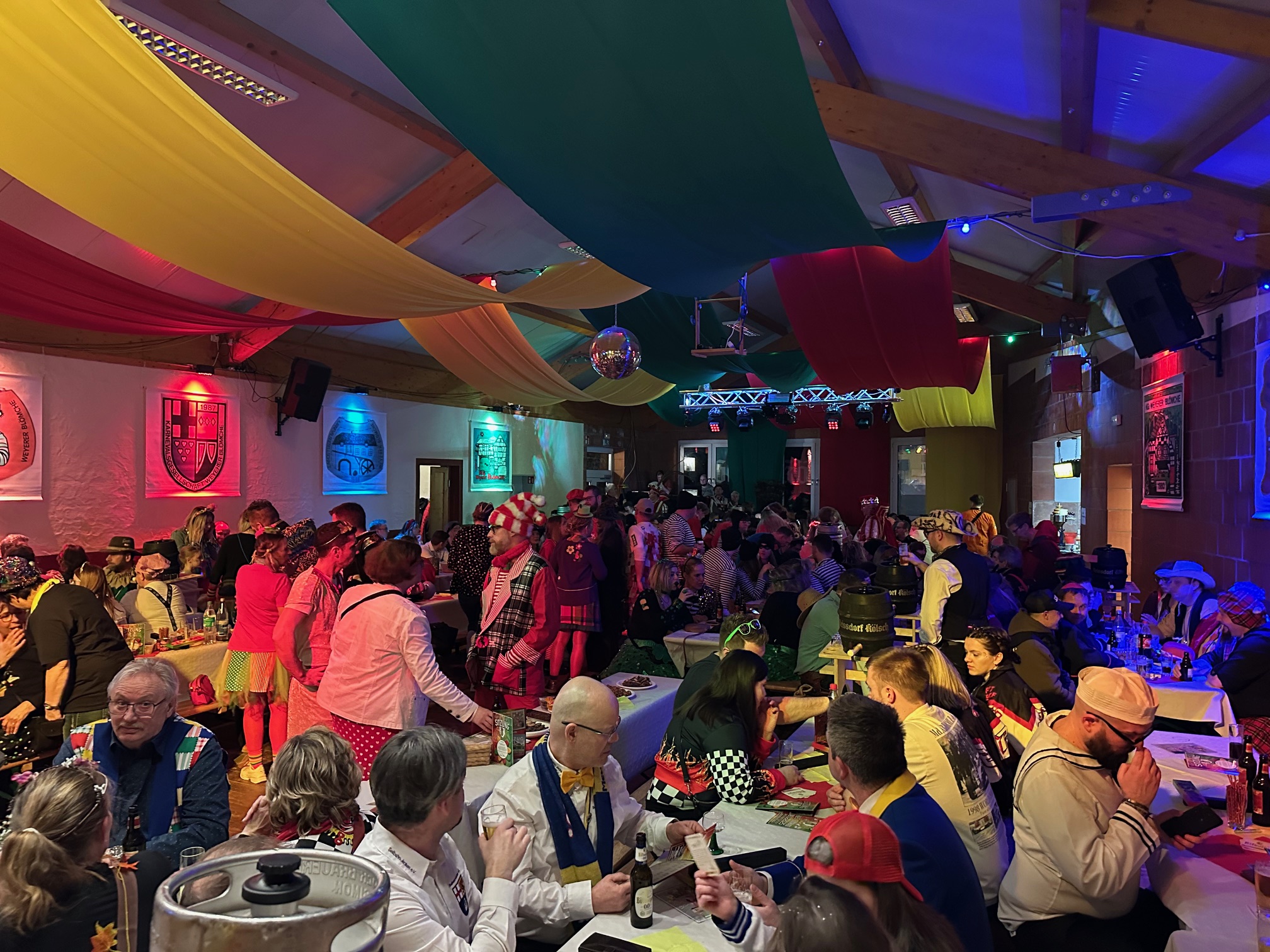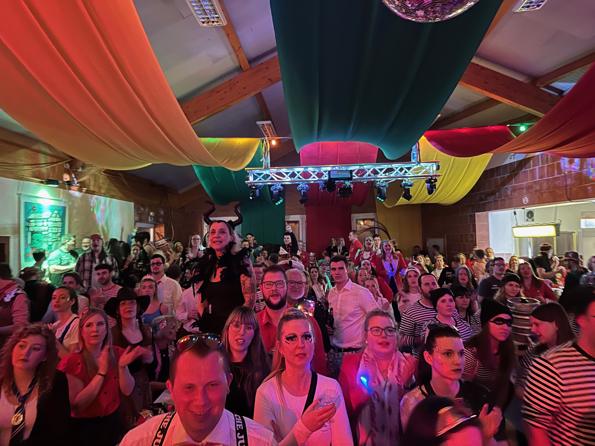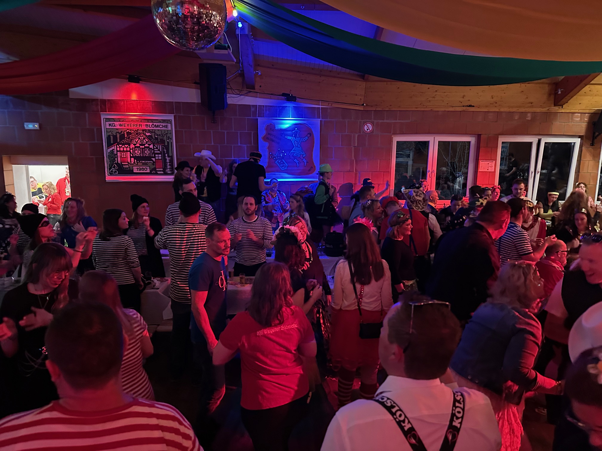 Und dann folgte ein absoluter Höhepunkt: Die Kölner Band ALUIS betrat die Bühne! Alte Bekannte, könnte man sagen, doch in Weyer sind es schon Freunde. Bereits im letzten Jahr hatten sie mit einem legendären Auftritt für Furore gesorgt, und auch diesmal wurde es nicht anders. Auf den Bänken und Tischen feierten die Jecken ausgelassen zu den kölschen Klängen. Ein unvergesslicher Moment war, als sich die gesamte Halle auf Kommando niederkniend vorbereitete, nur um dann gemeinsam in eine ekstatische Party zu explodieren – Gänsehaut pur!