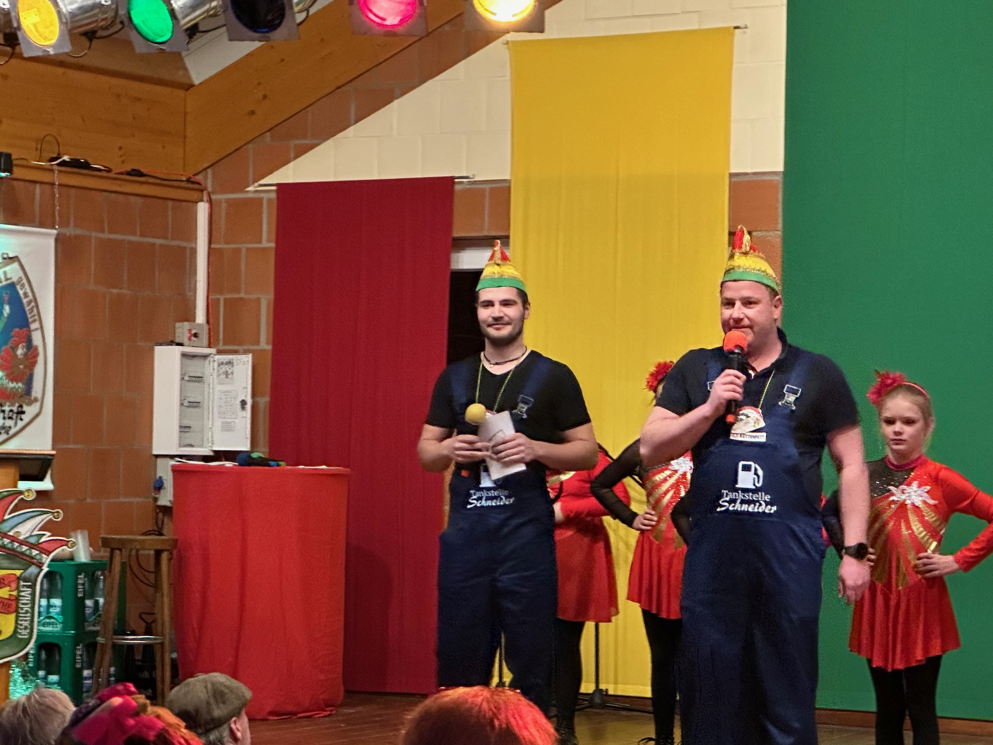 Am gestrigen Samstag öffneten sich um 18 Uhr die Türen zur karnevalistischen Bürgerhalle in Weyer. Es war Zeit für die legendäre Rut-Jell-Jröne Sitzung, die schon seit Wochen restlos ausverkauft war. Doch nur 48 Stunden vor der Show musste die KG Weyerer Blömche eine Hiobsbotschaft verdauen: Die beiden Sitzungspräsidenten Rene Wassong und David Rosenbaum mussten sich krankheitsbedingt abmelden. Ein Schockmoment für alle, denn die beiden hatten im letzten Jahr souverän durch den Abend geführt. Doch in Weyer findet man immer eine Lösung – und so übernahmen um 19 Uhr kurzerhand Thomas Nöthen und Marcel Hansen das Zepter. Als Tankwarte verkleidet, erinnerten sie an die Zeit, als es in Weyer noch eine Tankstelle gab – perfekt abgestimmt auf das Sessionsmotto: „Volljetank met Heiterkeit, fiert Weyer die jecke Narrenzeit!“.