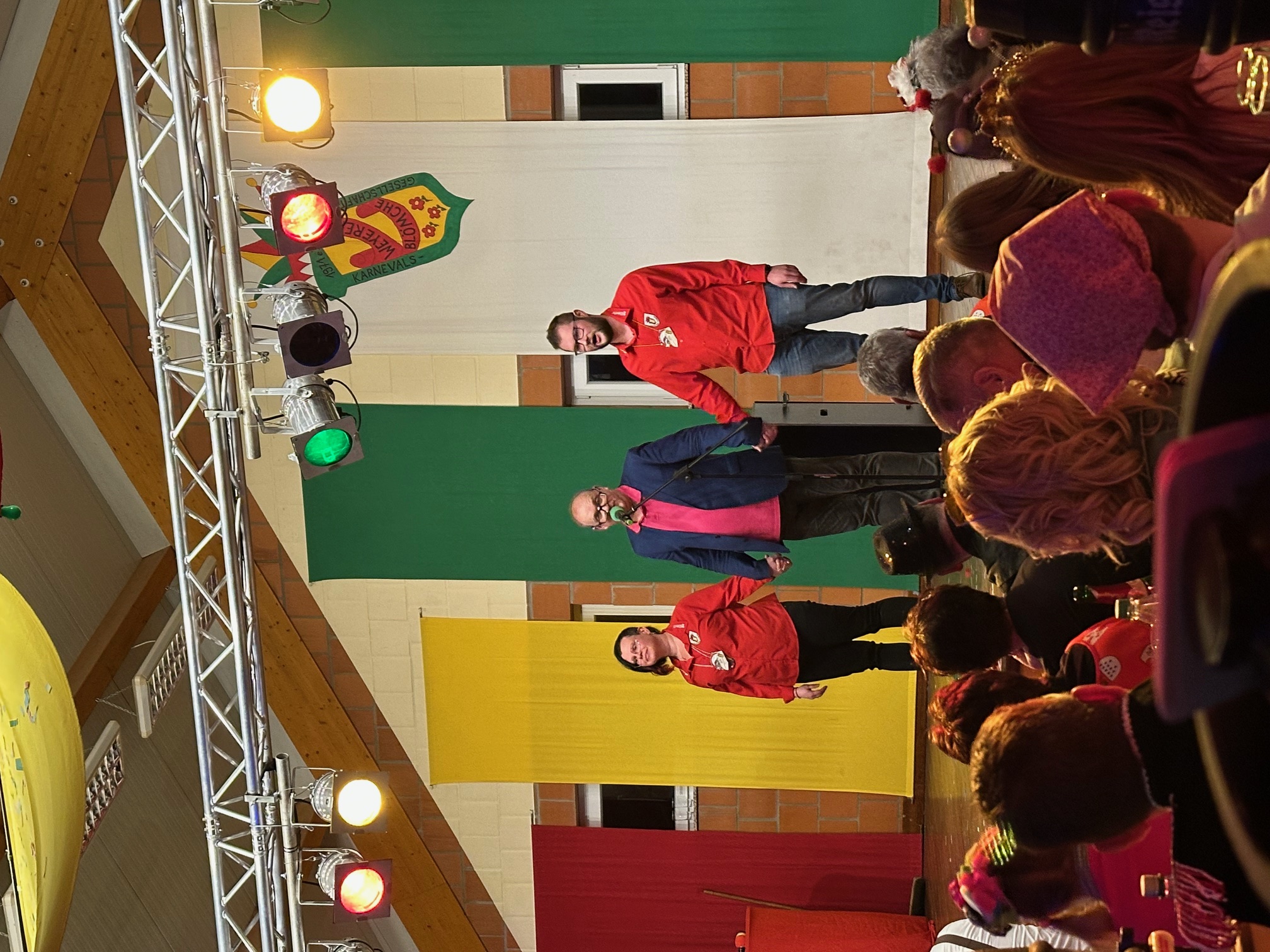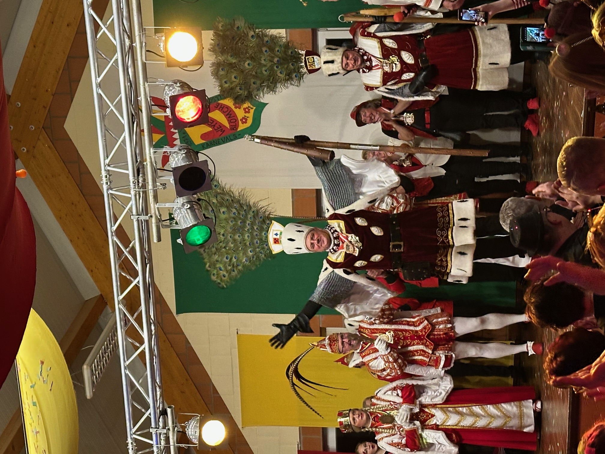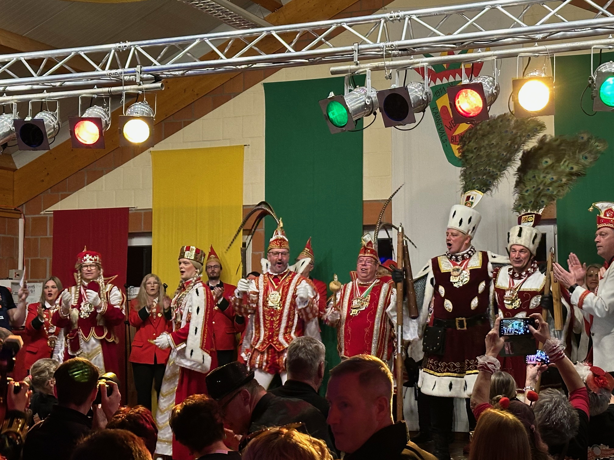 Doch dann wurde die Bühne kurz leer – allerdings nur für einen Moment, denn plötzlich wurde es prunkvoll: Die Tollitäten aus Kommern und Vussem samt Gefolge zogen in die Halle ein. Jungfrau Bruni (Björn Schäfer), Prinz Günter I. (Günter Schmitz) und Bauer Thomas (Thomas Metzen) aus Kommern sowie Jungfrau Mischaela, Prinz Carsten und Bauer Falk aus Vussem präsentierten sich in voller Pracht. Ein besonderes Highlight: Bauer Thomas, gebürtig aus Weyer, stand bereits vor Jahrzehnten im Kinderdreigestirn auf der Weyerer Bühne – ein Moment voller Nostalgie und Emotionen!