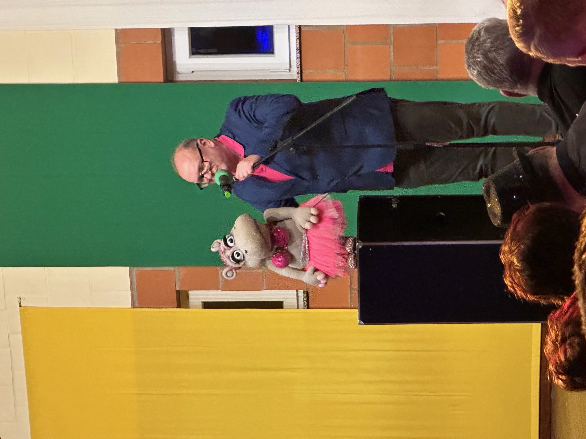 Kaum war der Glanz der Tollitäten verhallt, sorgte Michael Walta mit der wilden Hilde für eine Lachsalve nach der anderen. Hilde, das freche Nilpferd im rosa Tutu, träumte von einer Karriere als Balletttänzerin, und Walta, der geniale Bauchredner, brachte sie zum Leben. Als Sahnehäubchen gab es die mitreißende "Händedrück-Mitmachshow", bei der auch der Vorstand der KG Weyerer Blömche mit einbezogen wurde.