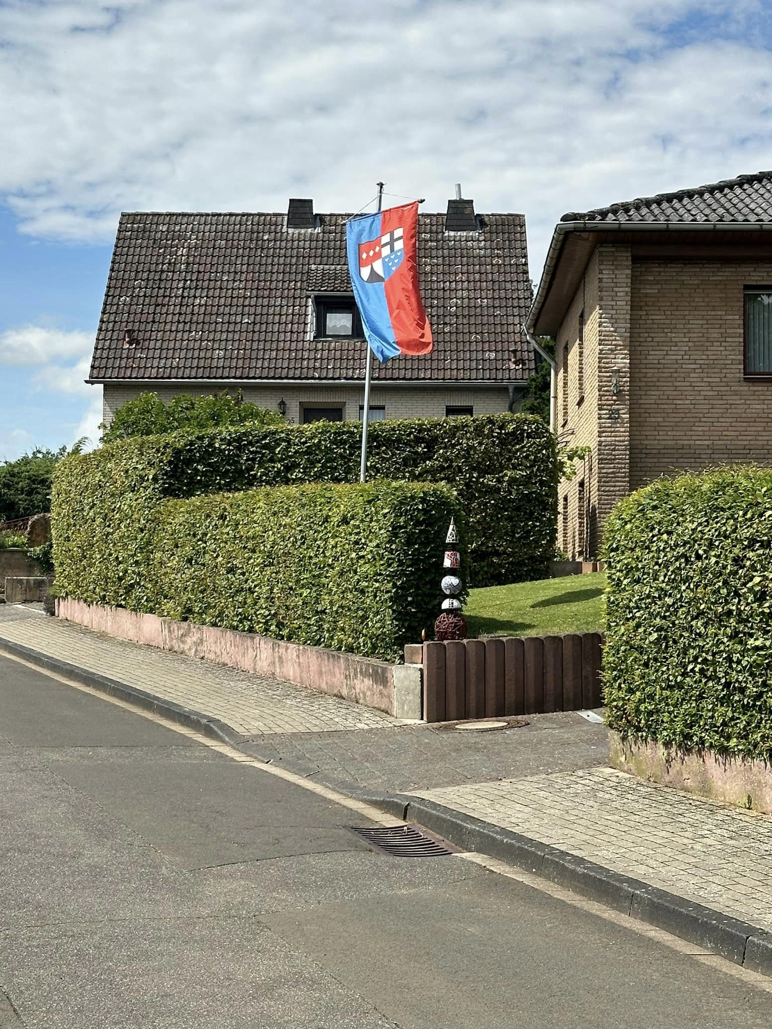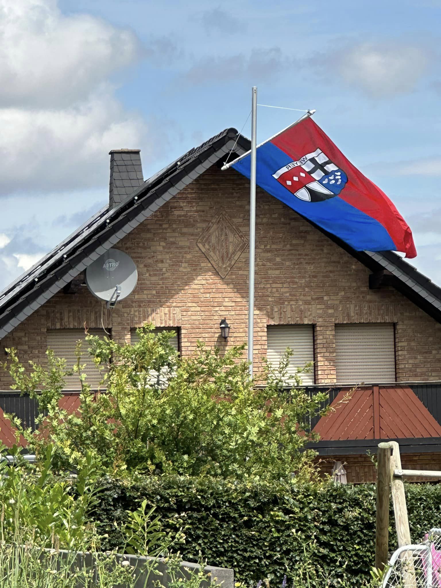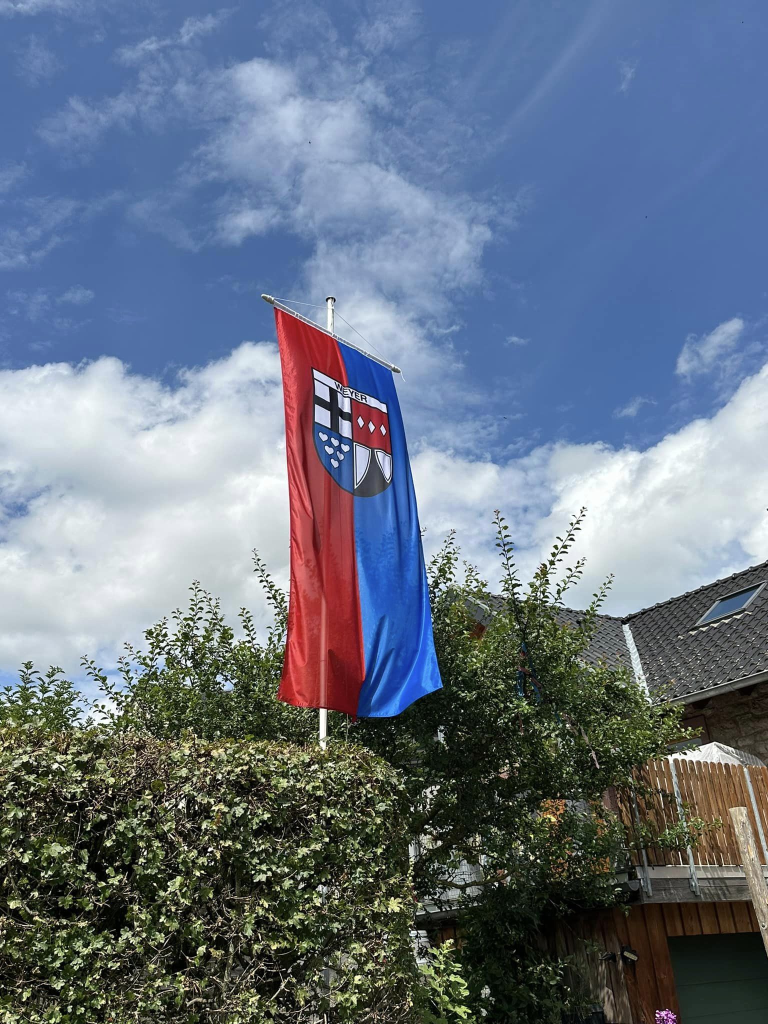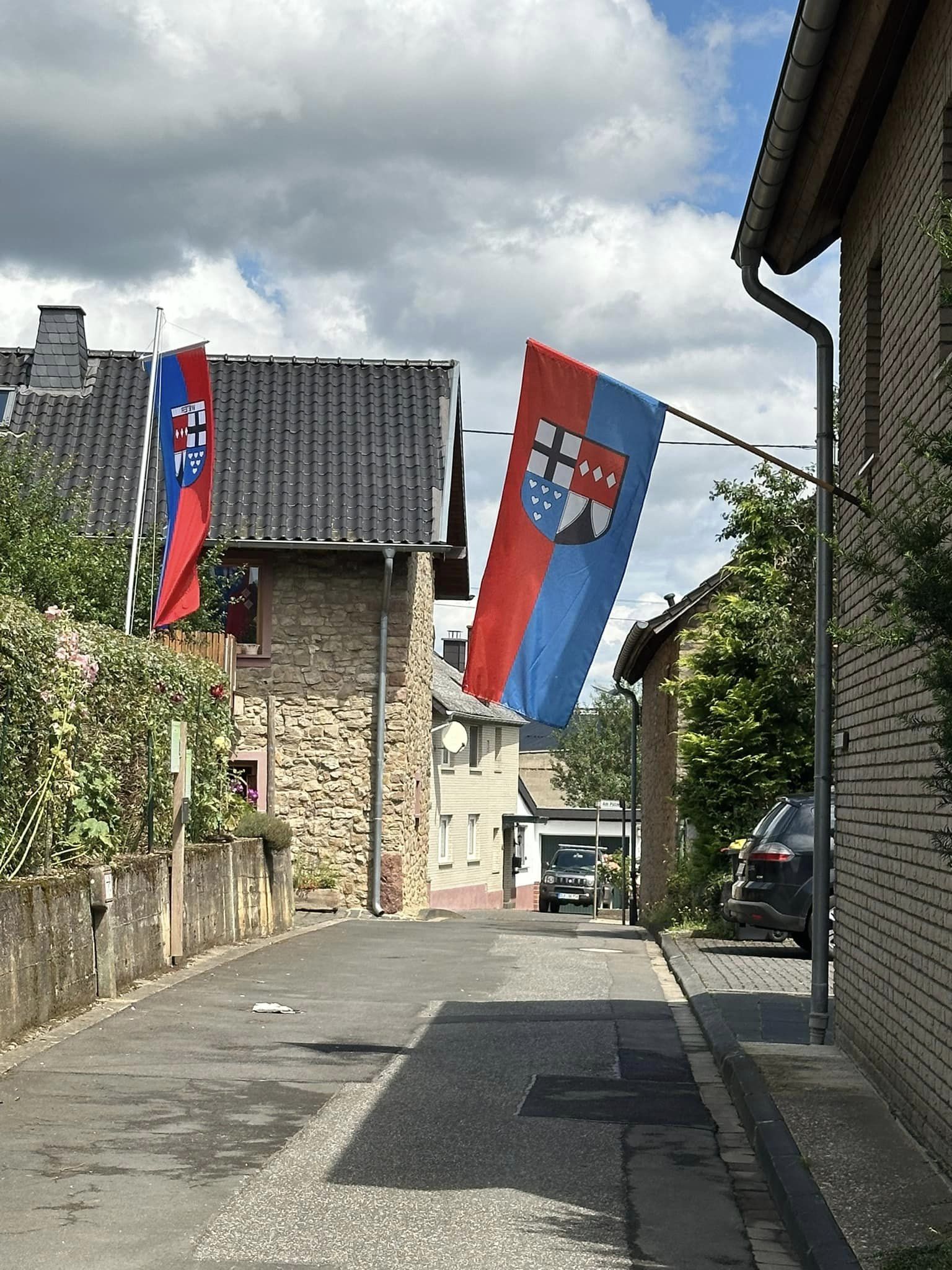 Vor kurzem riefen wir unsere Mitbürger dazu auf, zur Kirmes die Fahnen zu hissen, und das Dorf folgte begeistert. Überall wehten am gestrigen Tag die Dorffarben im Wind – große und kleine Fahnen, an Masten, Häuserwänden und sogar in den Bäumen. So wurde die tiefe Verbundenheit der Dorfbewohner deutlich sichtbar.