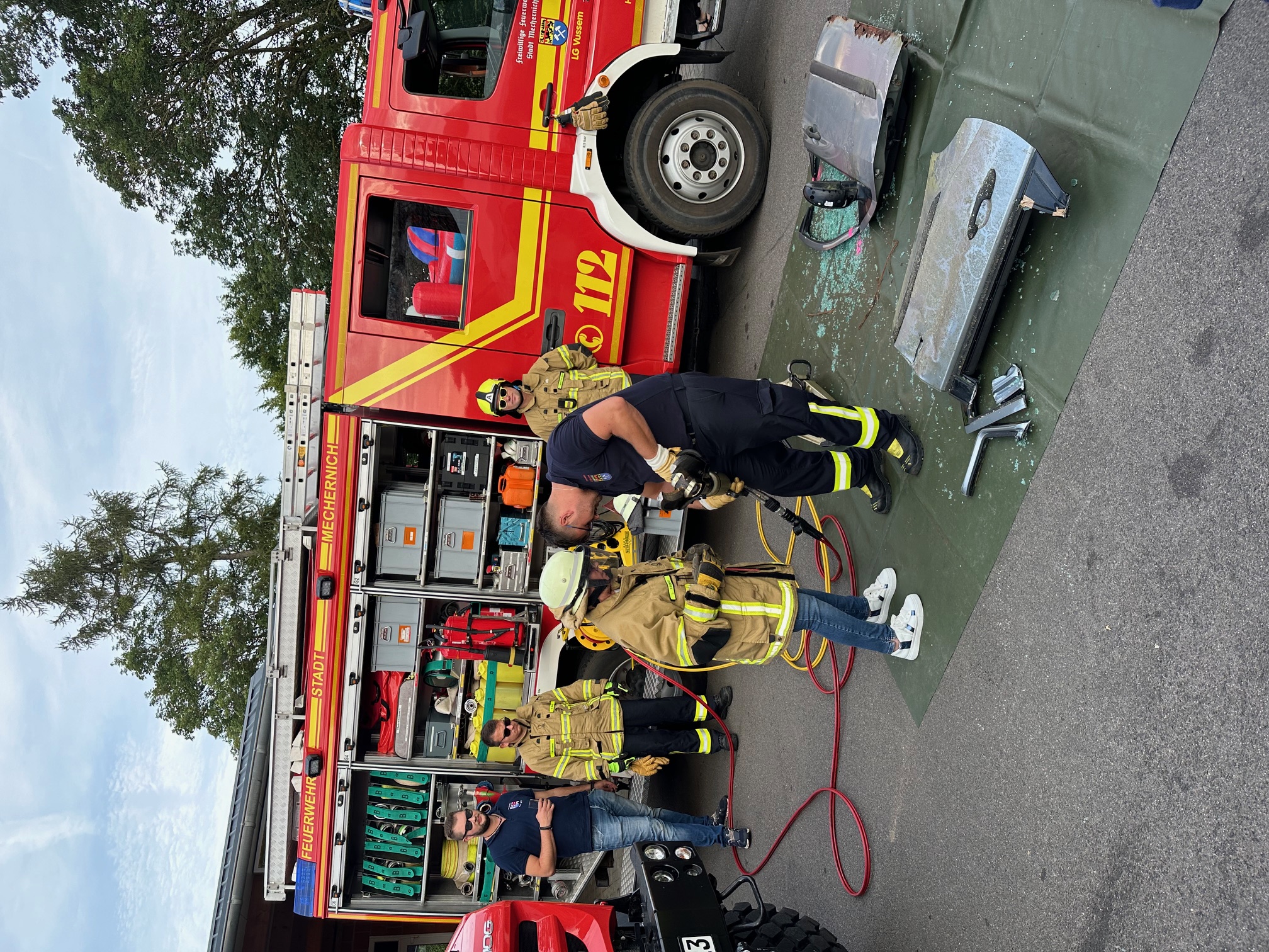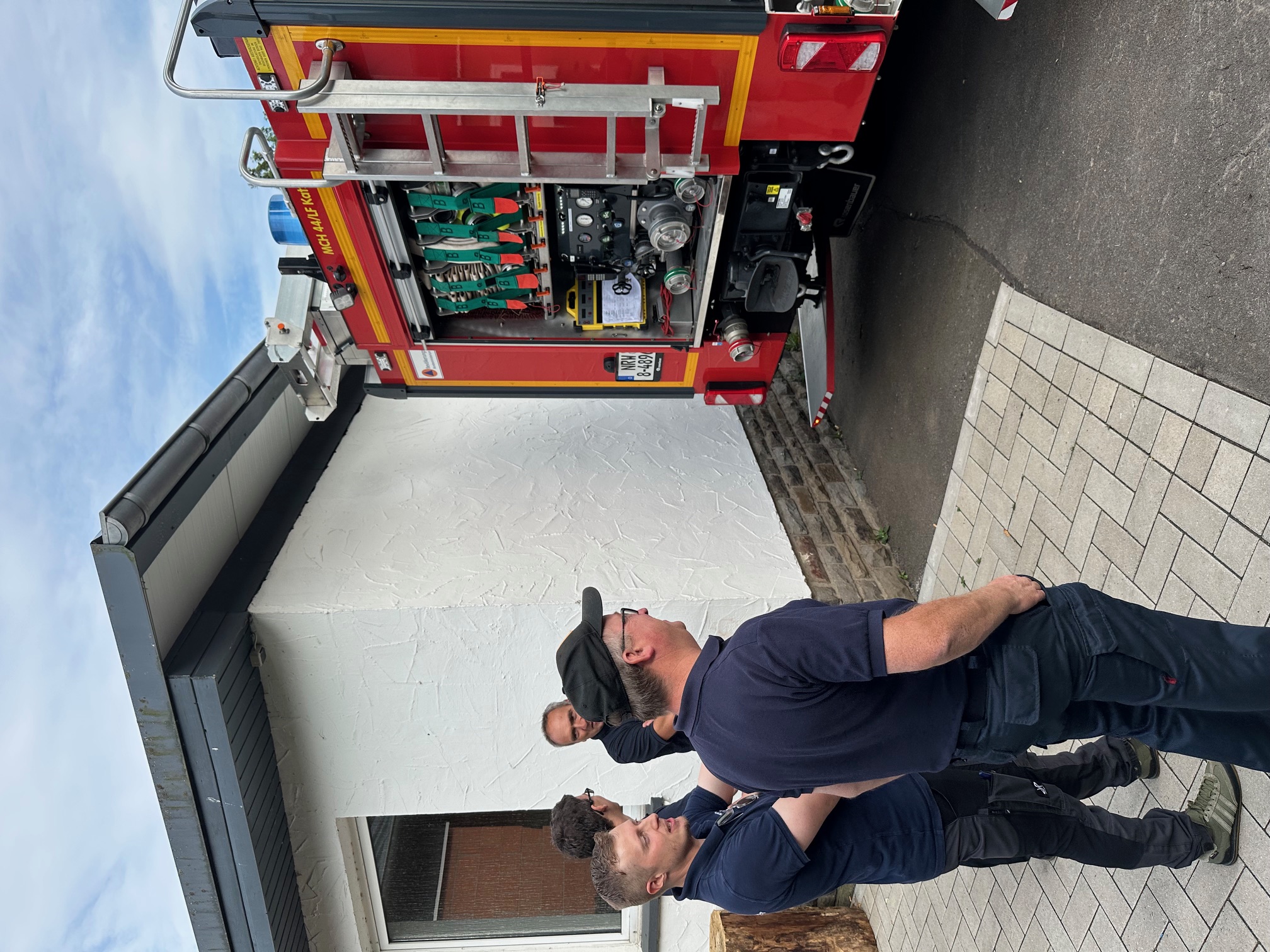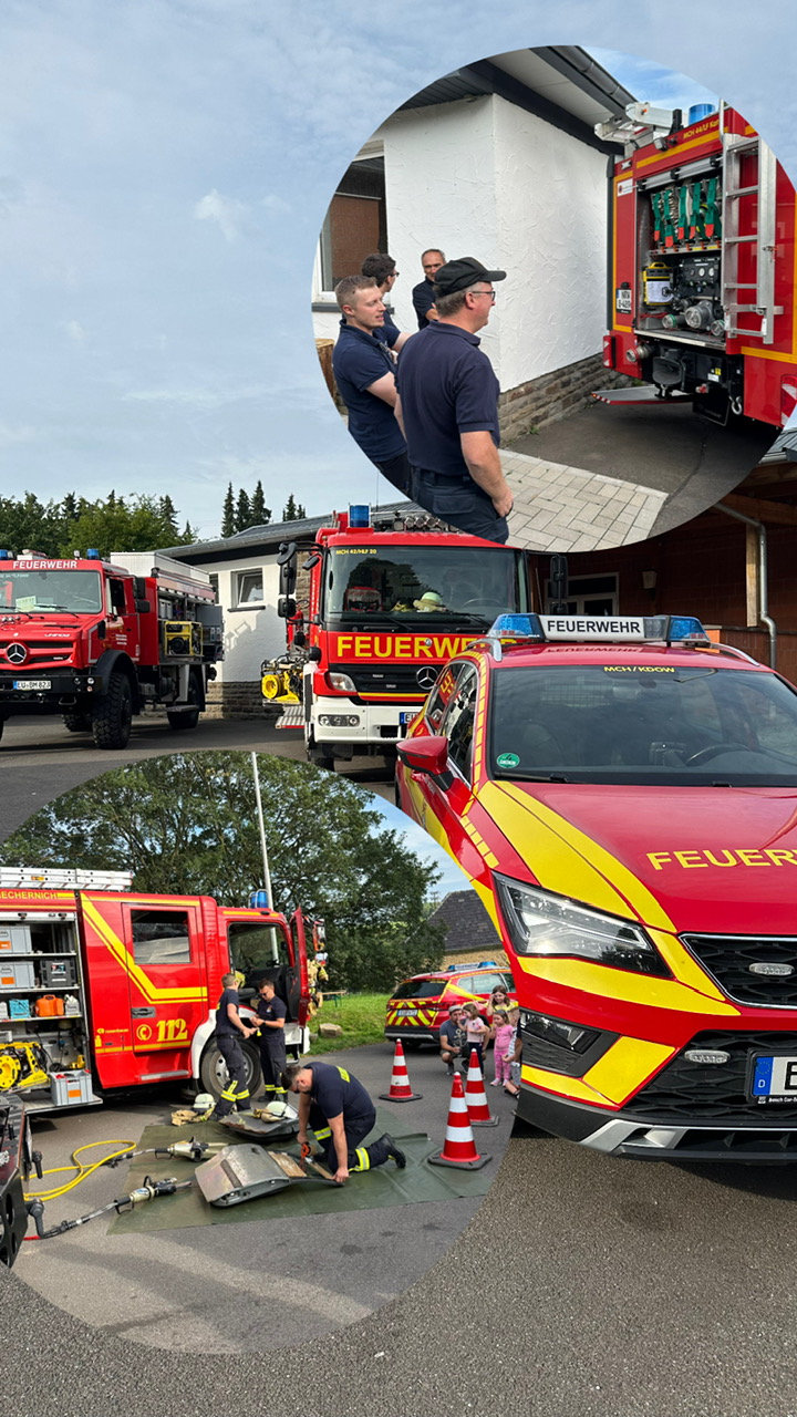 Ab 17 Uhr ging es fachlich, spielerisch und freudig vor dem Spritzenhaus zur Sache. Die Kameraden erklärten den interessierten Dorfbewohnern die Fahrzeuge und viele waren überrascht, wie modern die heutige Feuerwehr ausgestattet ist. Besonders beeindruckend war die Präsentation der Kameraden aus Vussem, die an ihrem Fahrzeug die Schere und Spreizer vorführten, welche häufig bei Verkehrsunfällen zum Einsatz kommen. Das interessierte Publikum hatte sogar die Möglichkeit, diese technischen Geräte selbst einmal zu bedienen.