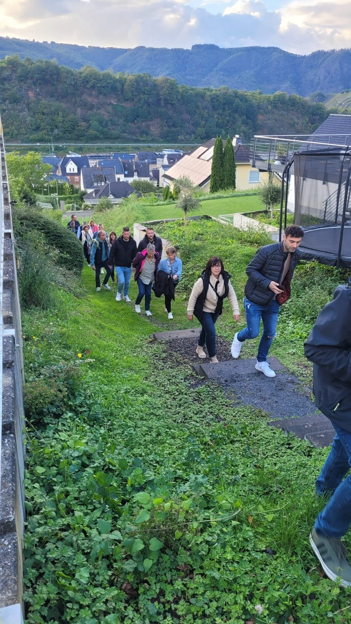 Nach dieser gelungenen Einstimmung führte der Weg die Gruppe zu Fuß zum Straßenweinfest in Neef, einem jährlichen Fest, das die Weinbaukultur der Moselregion feiert. Neben weiteren Weinverkostungen, bei denen der berühmte Mosel-Riesling im Mittelpunkt steht, erwarteten die Besucher musikalische Darbietungen, Tanz und viele gesellige Momente. In der malerischen Kulisse der Mosellandschaft genossen die Teilnehmer die herzliche Atmosphäre des Festes und schicken liebe Grüße von der Mosel!
