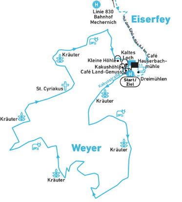 Wer vom Bahnhof Mechernich aus startet, ist mit dem Rad oder zu Fuß schnell im Grünen. Besonders beliebt ist die beschilderte Eifelschleife „Rund um die Kakushöhle“ – ein rund 10 Kilometer langer Rundweg, der sich hervorragend für eine Kräuterwanderung eignet. Entlang des Weges begegnet man einer Vielzahl an essbaren Pflanzen, die nicht nur schmackhaft, sondern auch gesund sind.
