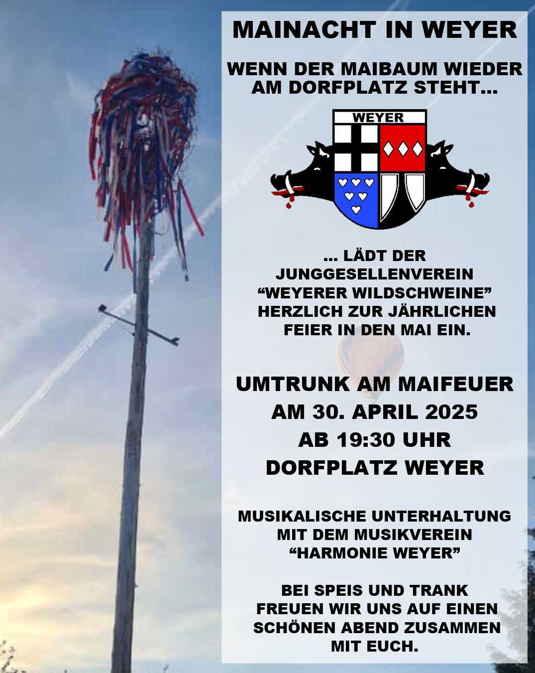 Mit dem April startet auch wieder die spannende Zeit für unseren Junggesellenverein "Weyerer Wildschweine". Die Vorbereitungen für den Mai stehen an, und schon bald wird auf dem Dorfplatz fleißig gewerkelt. Wie in jedem Jahr sind alle jungen Männer, die in diesem Jahr das 16. Lebensjahr vollenden, herzlich eingeladen, sich an den traditionellen Maivorbereitungen zu beteiligen.