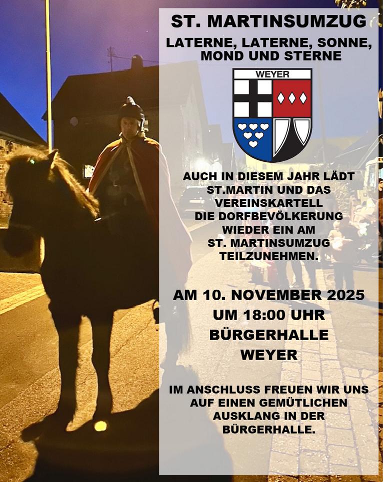 Der St. Martinsumzug hat in Weyer eine lange Tradition und ist fester Bestandteil des dörflichen Jahreslaufs. Der Brauch geht auf den Heiligen Martin von Tours zurück, der durch seine Tat der Nächstenliebe bekannt wurde: Er teilte seinen Mantel mit einem frierenden Bettler und brachte damit Licht und Wärme in die Dunkelheit.