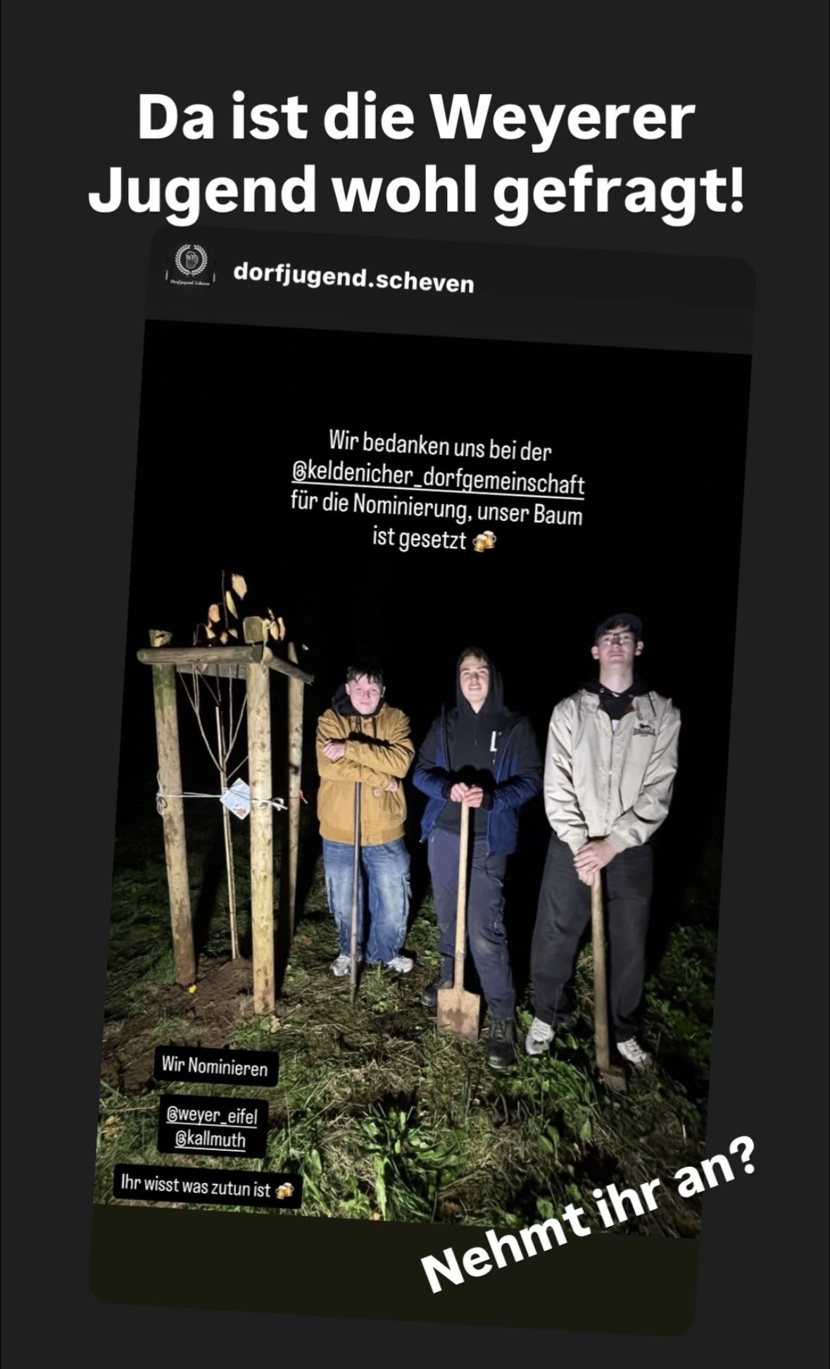 Am späten Mittwochabend nominierte die Dorfjugend Scheven uns Weyerer zur Teilnahme an der Baum-Pflanz-Challenge. Auch unser Männerballett, der Junggesellenverein und die Karnevalsgesellschaft waren bereits von anderen Vereinen herausgefordert worden – ein Aufruf, dem wir uns natürlich nicht entziehen wollten. Doch erst stellte sich die Frage: Wer sollte für Weyer antreten?