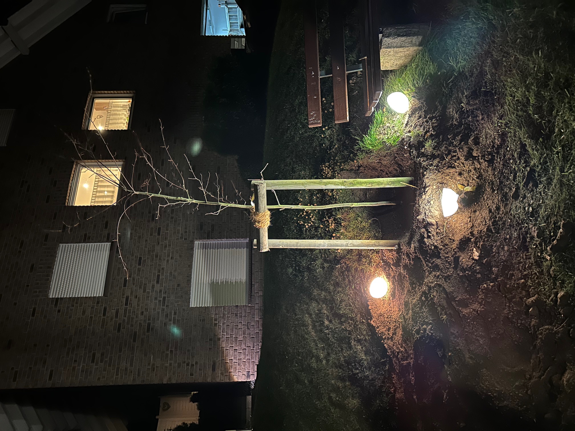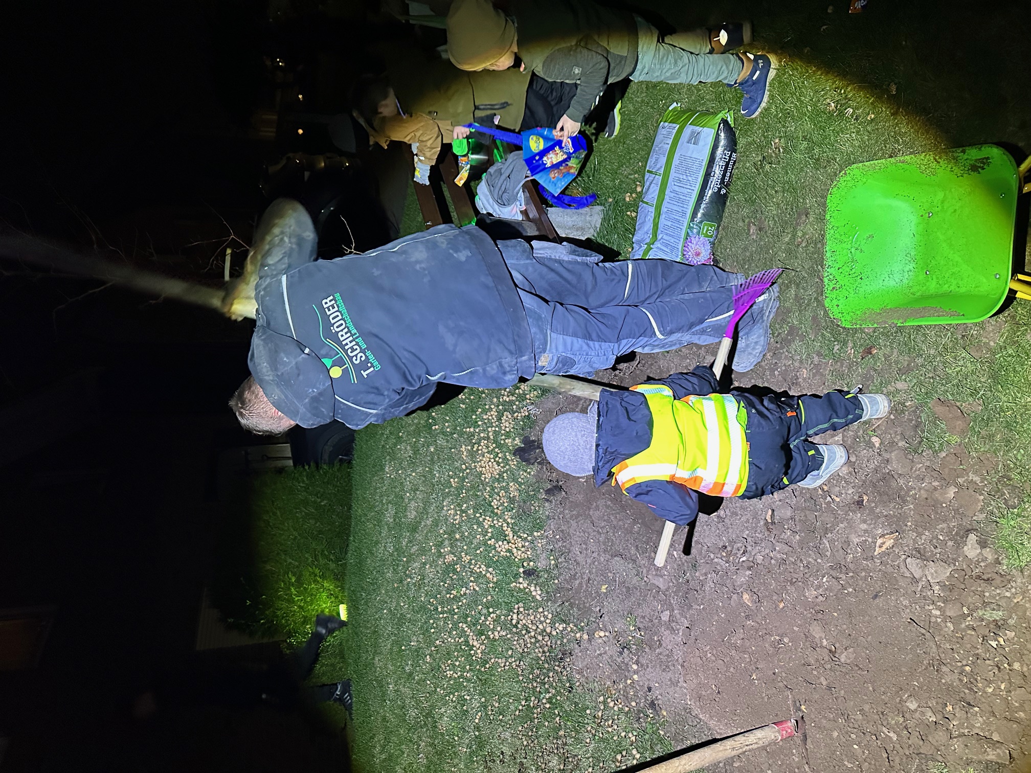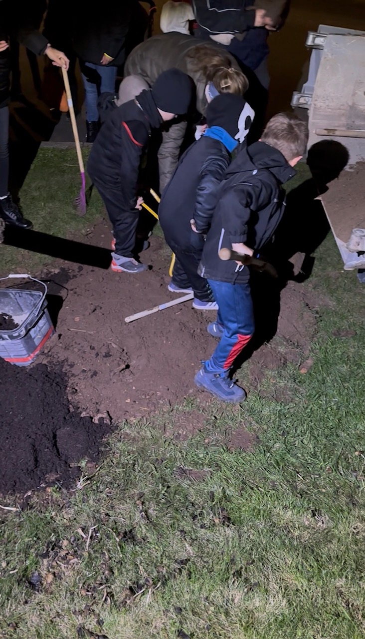 Viele im Dorf wünschten sich an dieser Stelle einen neuen Baum, und so rückte am folgenden Abend die Firma Arns mit schwerem Gerät an, um den alten Wurzelstumpf zu entfernen. Am Freitagmorgen waren dann nur noch kleinere Erdarbeiten nötig, um alles für die Kinder vorzubereiten. 🌱