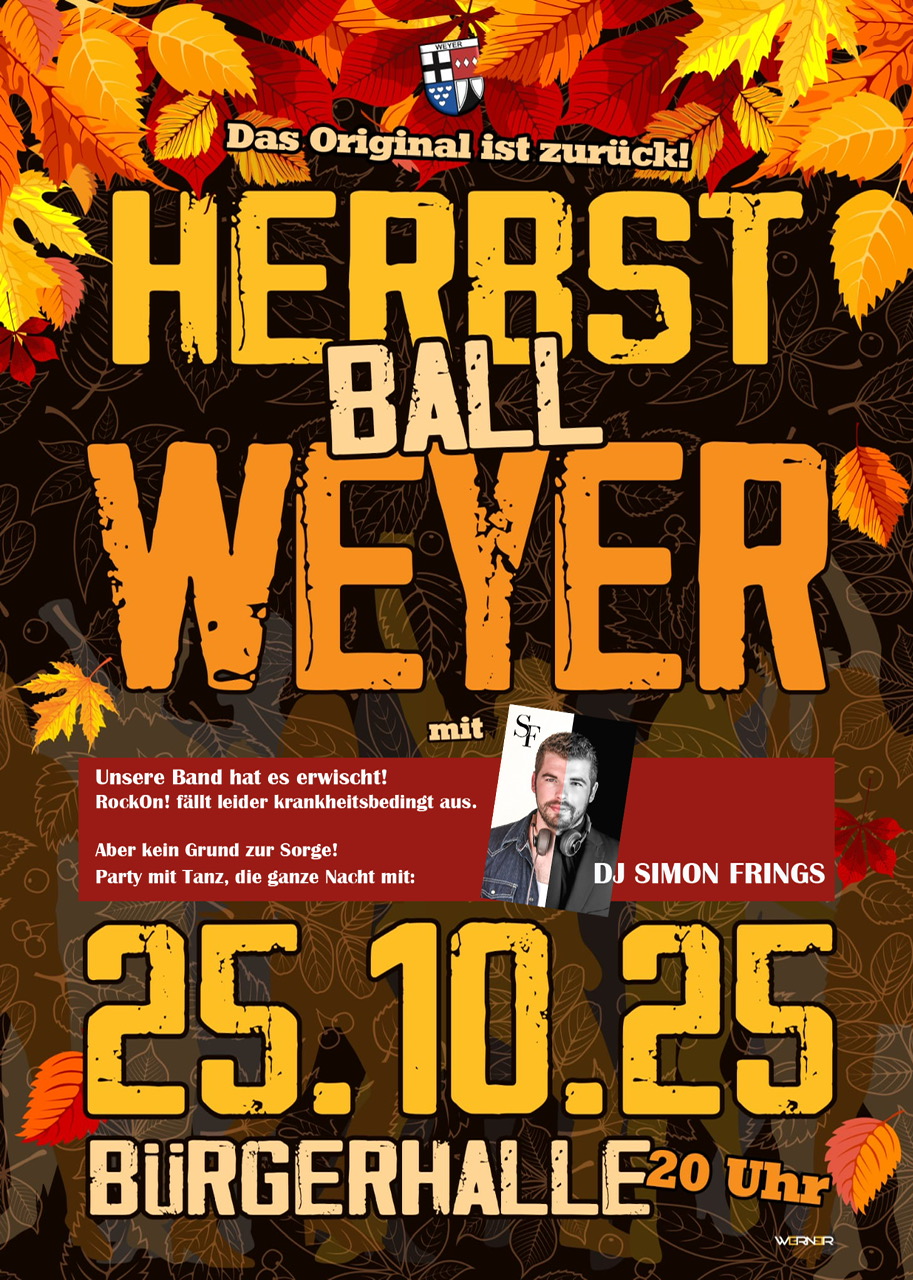 Manchmal kommt alles anders, als geplant – doch aufgeben ist keine Option! Leider musste die Band RockOn! ihren Auftritt beim diesjährigen Herbstball absagen, da mehrere Bandmitglieder krank geworden sind. Doch es gibt keine Herausforderung, für die wir nicht auch eine Lösung finden: DJ Simon Frings wird am Samstagabend auf der Bühne stehen und für beste Stimmung sorgen! Mit seinem Gespür für Musik und Publikum bringt er die Halle zum Beben und sorgt dafür, dass der Herbstball in Weyer zu dem wird, was er sein soll – eine unvergessliche Nacht voller Tanz, Spaß und guter Laune.