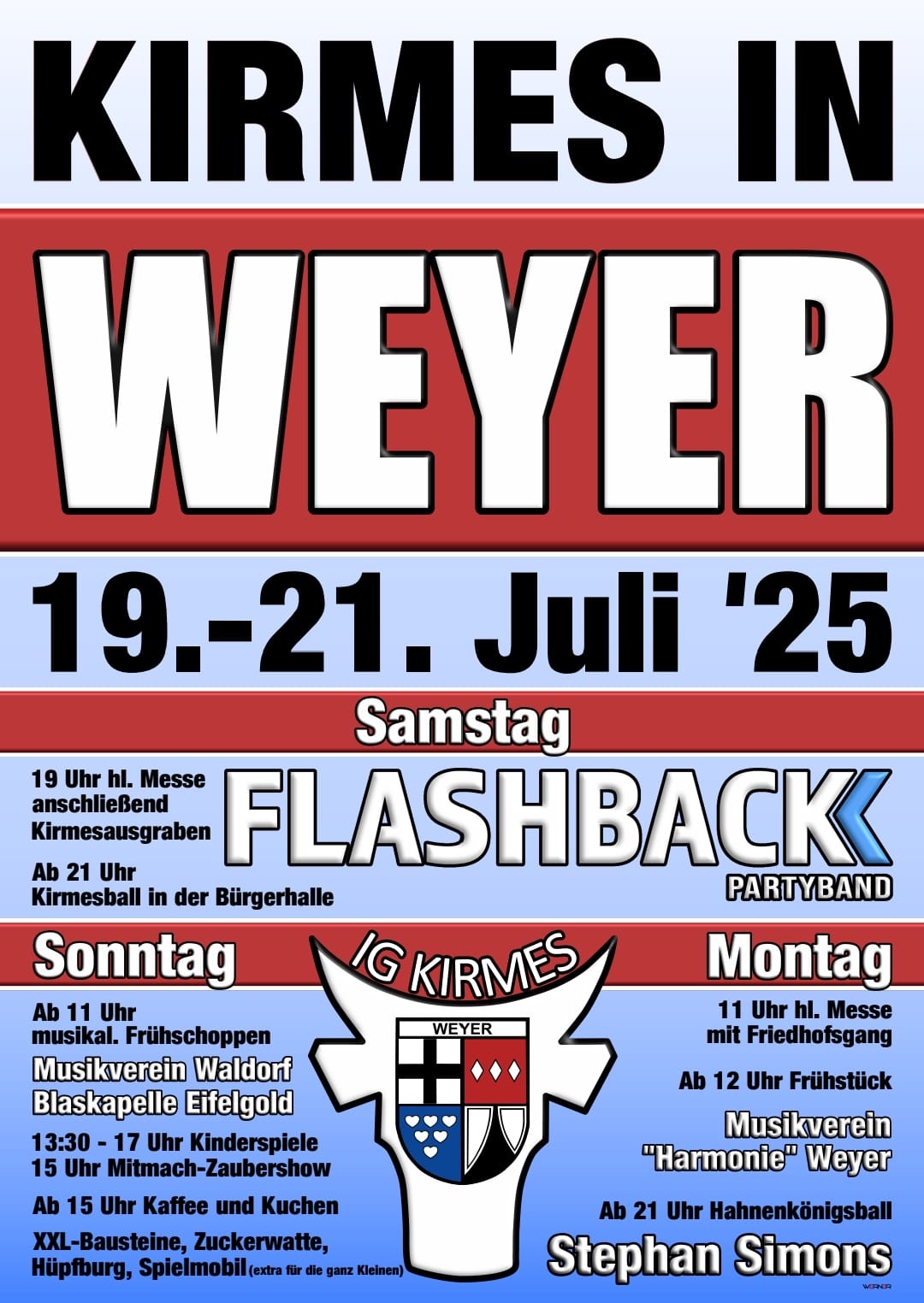 Es ist wieder soweit – in der Eifel beginnt die schönste Zeit des Jahres: Kirmeszeit! Und wer einmal dabei war, weiß, dass die Kirmes in Weyer mehr ist als nur ein Dorffest. Es ist das höchste Fest im Jahr, eine lebendige Tradition und ein Treffpunkt für Jung und Alt. Vom Samstag, bis zum Montag verwandelt sich unser Ort in einen Platz voller Herzlichkeit, Lebensfreude und Gemeinschaft.