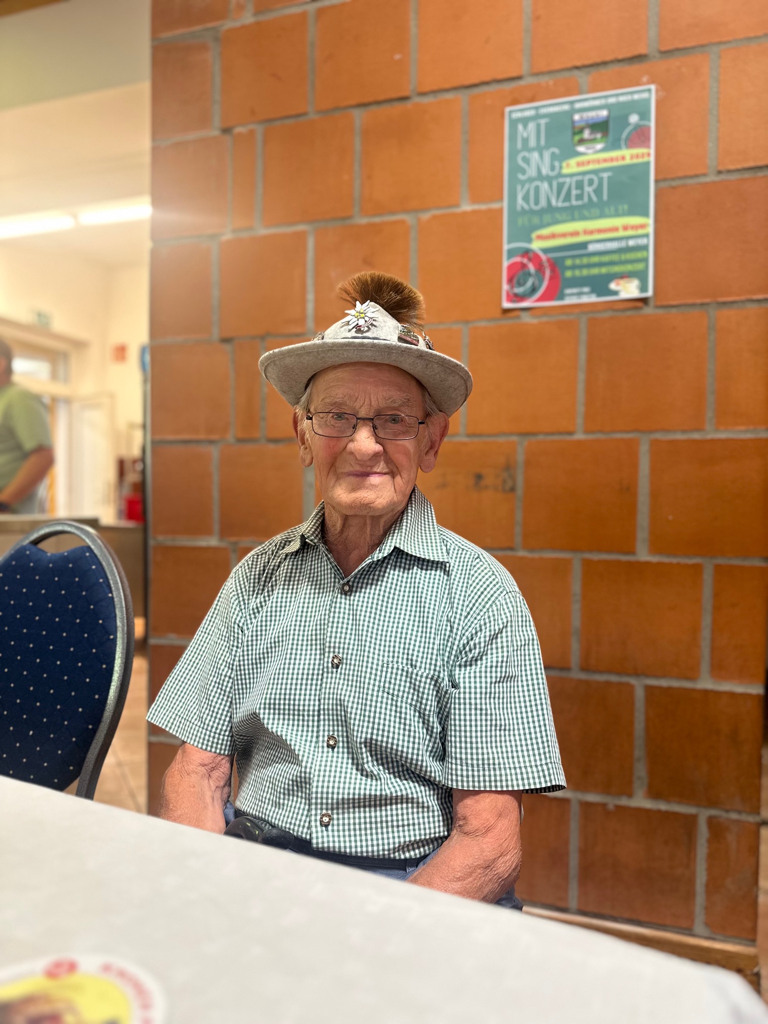 Das Repertoire des Musikvereins umfasst über 100 Lieder – für diesen Nachmittag wurde daraus eine bunte und stimmungsvolle Auswahl zusammengestellt. Gesungen wurde gemeinsam mit Reiner Schnichels auf der Bühne und dem Publikum im Saal: Klassiker wie Über den Wolken, Marmor, Stein und Eisen bricht oder Tulpen aus Amsterdam wechselten sich ab mit kölschen Liedern wie In unserem Veedel oder Rut sin de Ruse. Besonders kraftvoll erklangen das Udo-Jürgens-Medley und das Kultlied Sierra Madre, die weit über die Bürgerhalle hinaus ins Dorf hineinschallten. Dank vorbereiteter Liedermappen hatten alle Gäste die nötige Textsicherheit, um voller Begeisterung mitzusingen.