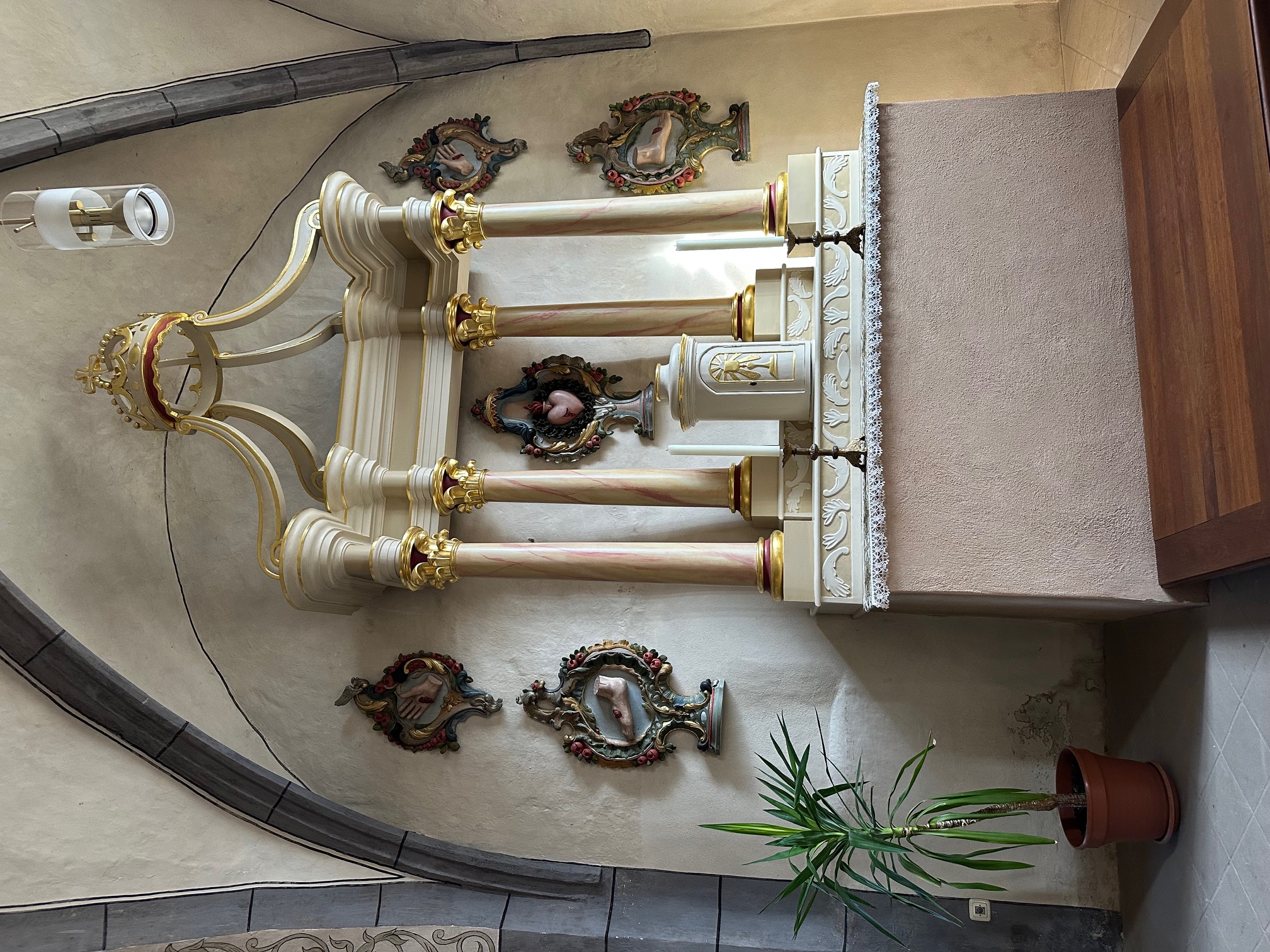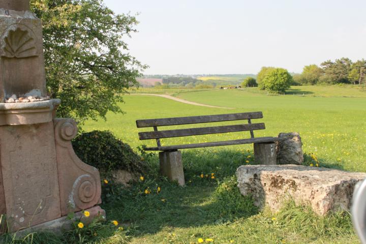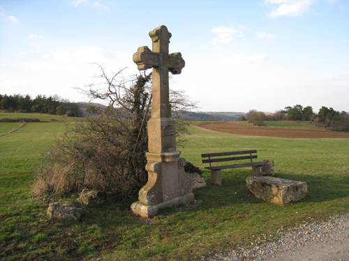 Hier auf dem alten Kirchweg von Eiserfey nach Weyer, wurde im Jahr 1727 das sogenannte Bruderschaftskreuz der ehemaligen Fünf-Wunden-Bruderschaft errichtet. Das Kreuz aus rotem Sandstein zeigt im oberen Bereich symbolisch die fünf Wunden Christi, aus der gleichen Zeit stammten die Fünf wunderschönen holzgeschnitzten Kartuschen, welche den rechten Seitenaltar der nahegelegenen Pfarrkirsche St. Cyriakus umrahmen und ebenfalls die fünf Wunden Christi symbolisieren. Die Fünf-Wunden-Bruderschaft war die älteste und weit über die Grenzen von Weyer hinaus bekannteste Bruderschaft. Hauptzweck dieser Vereinigung war die Sorge und das Gebet für die Verstorbenen.