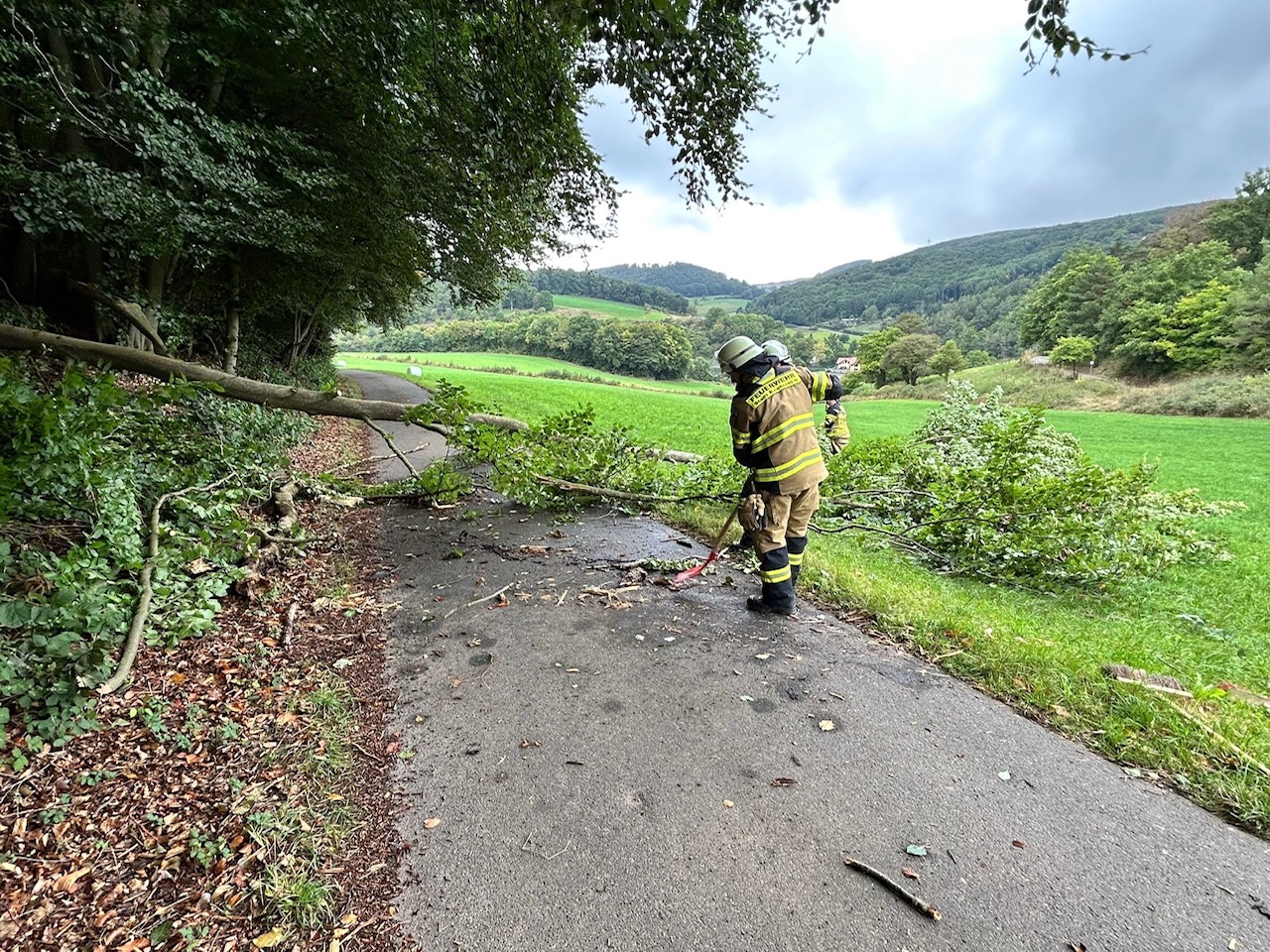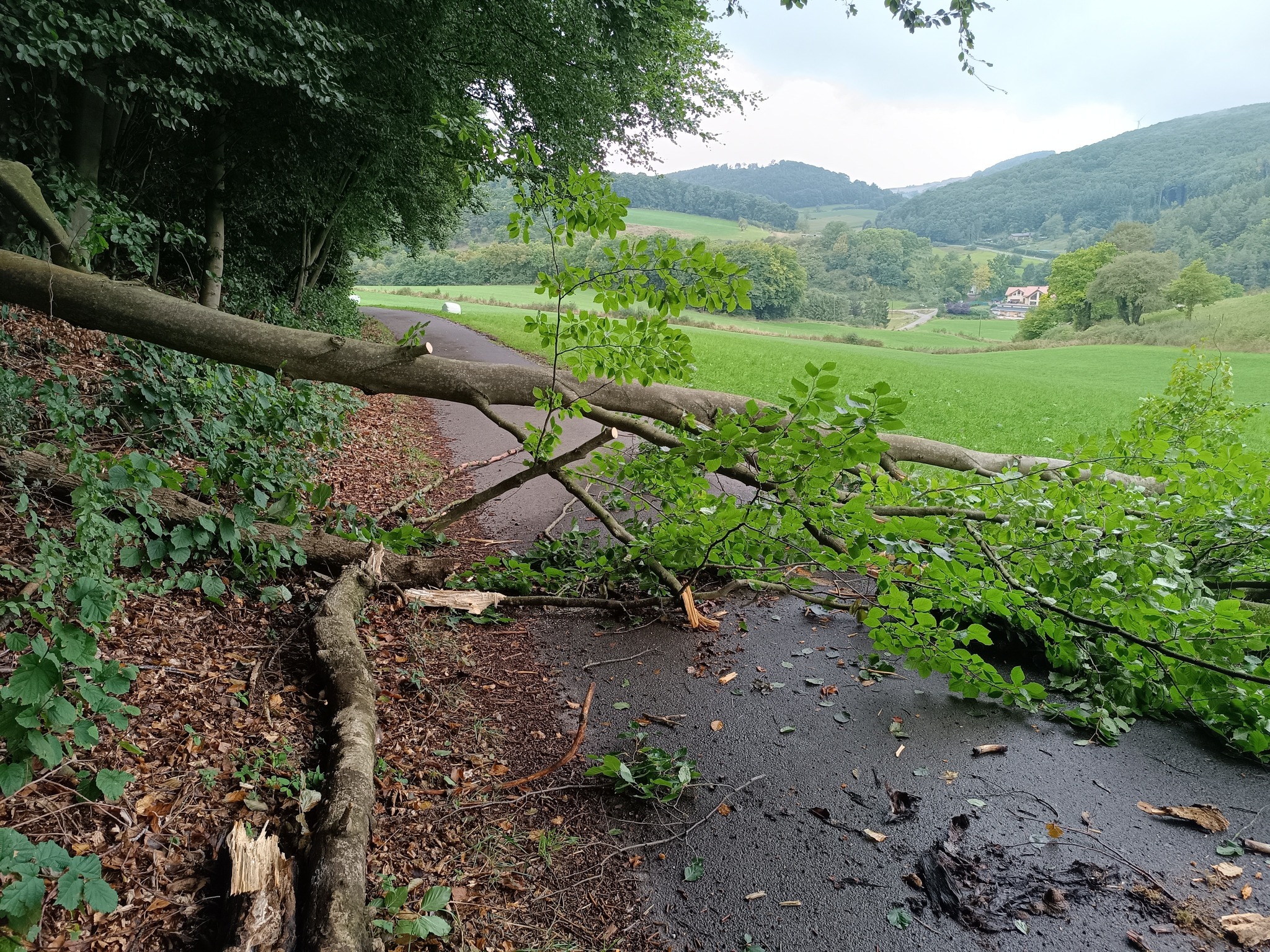 Zwischen Weyer und Urfey musste die Freiwillige Feuerwehr zu einem kleineren Einsatz ausrücken: Ein umgestürzter Baum blockierte die Fahrbahn. Die Wehr räumte die Straße und stellte die Verkehrssicherheit zügig wieder her.