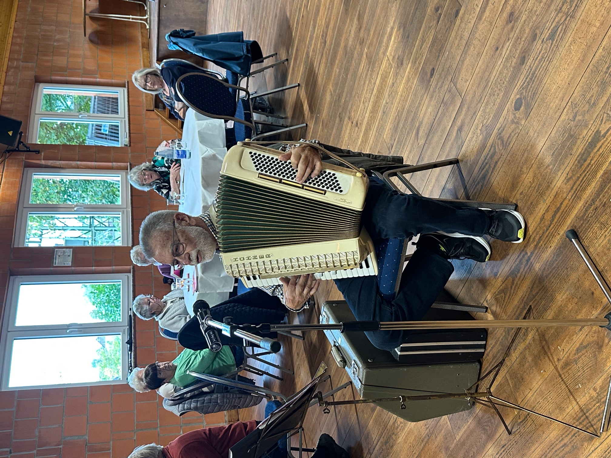 Bei Kaffee und Kuchen entwickelte sich sofort ein lebhafter Austausch unter den Gästen. Für musikalische Unterhaltung sorgte Heinz Schmitz mit seinem Akkordeon und einer Sammlung an Liederbüchern. Schon nach wenigen Takten erklangen vertraute Melodien, die alle mitsingen konnten – darunter auch das Weyer-Lied, das inzwischen immer häufiger seinen Weg in die Ohren und Herzen der Dorfgemeinschaft findet.