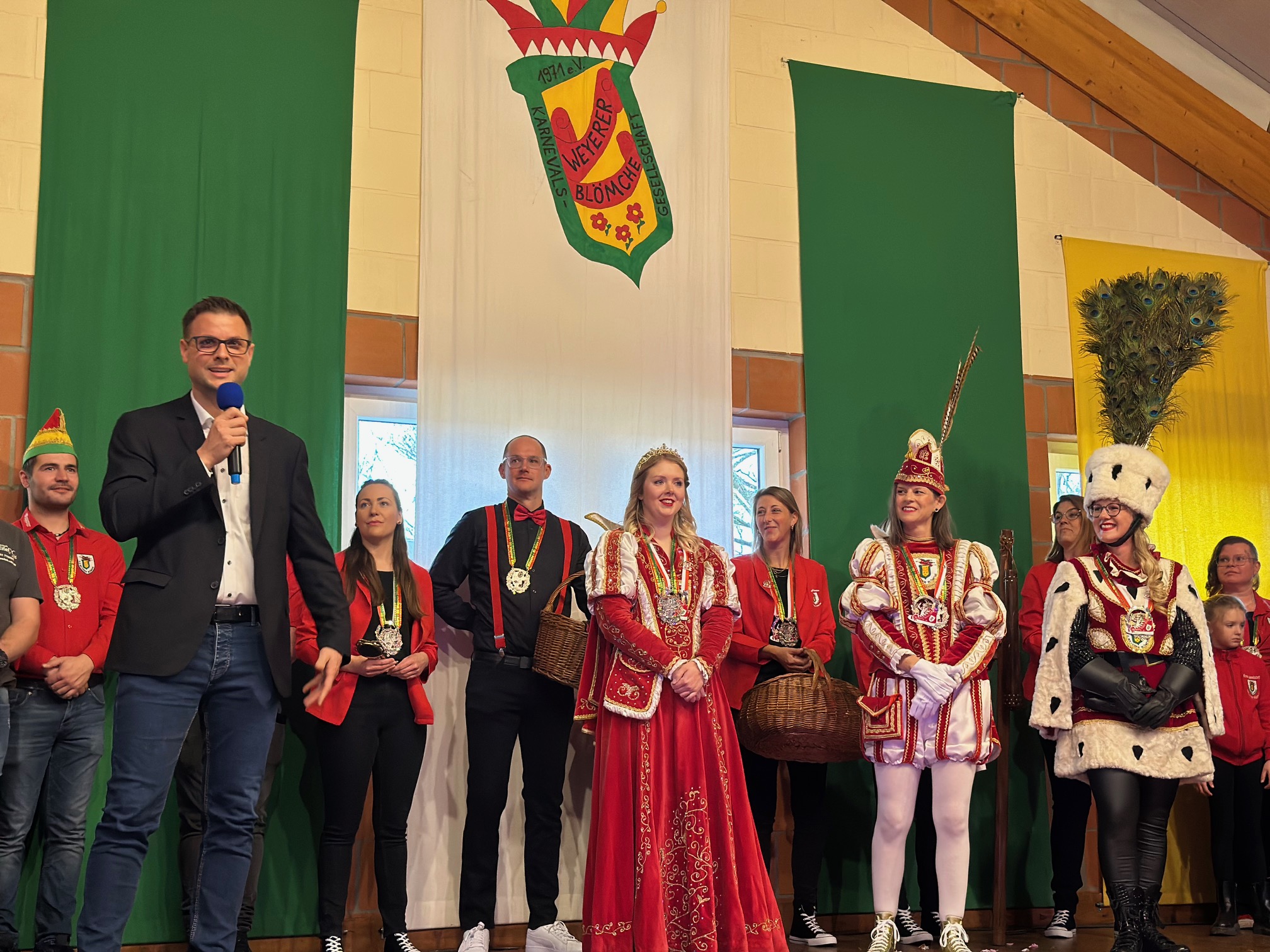 Unter großem Beifall betrat das Dreigestirn die Bühne. Durch das Programm führte – passend zum Jubiläum – ein echtes Urgestein des Weyerer Karnevals: Robert Schneider, der sich eigens für diesen Tag noch einmal das Mikrofon schnappte.