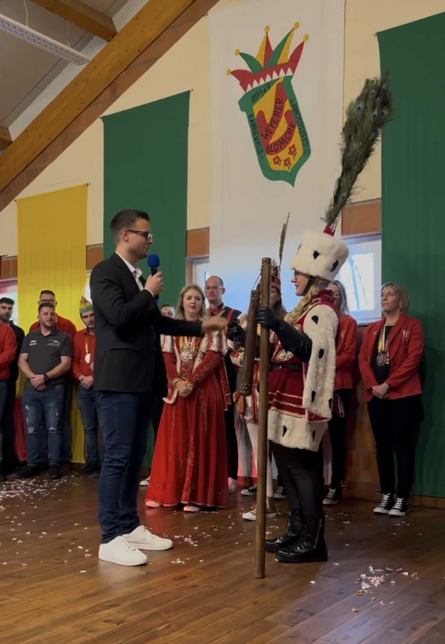 Eine besondere Premiere gab es für Bürgermeister Michael Fingel, der zum ersten Mal eine Proklamation durchführen und die närrischen Insignien – Zepter, Dreschflegel und Spiegel, sowie den Schlüssel zum Ort – überreichte und den neuen Tollitäten eine großartige Session wünschte. Auch das letzte Weyerer Dreigestirn, Björn Wassong und Michael Lock, ließen es sich nicht nehmen, persönlich zu gratulieren und gute Wünsche zu überbringen.