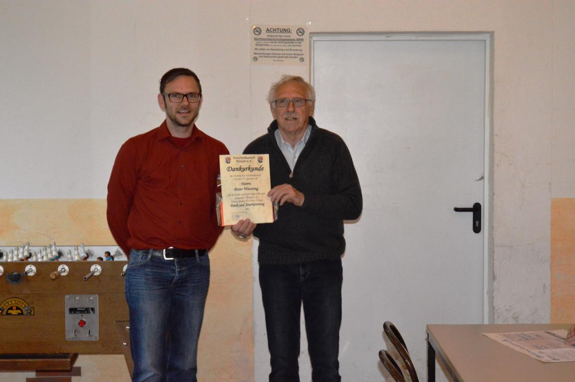 Im Anschluss an die Spendenüberreichung konnte das Vereinskartell ein weiteres Präsent überreichen. Im vergangen Jahr feierte man nicht nur 40 Jahre Stadt Mechernich, sondern der Ortsvorsteher des Ortes Weyer und gebundenes Vorstandsmitglied des Vereinskartells Peter „Ivo“ Wassong konnte sein 40-jähriges Dienstjubiläum als Ortssheriff von Weyer feiern. Sein Sohn und gleichzeitig Kartellvorsitzender Björn dankte ihm stellvertretend für alle Vereine des Ortes für die herausragenden und prägenden Leistungen für seinen Heimatort und dessen Vereine. In einem kurzen Rückblick wurden der Bau der neuen Leichenhalle, die Umsetzung und Neuerrichtung des Ehrenmales, die Übernahme des ehemaligen Schulgebäudes als Bürgerhaus und „Last but not least“ sein großes Engagement rund um den Bau und die Pflege der neuen Bürgerhalle als Meilensteine seines Wirkens hervorgehoben. Auch für dieses Engagement erhielt die Ortsbevölkerung Weyers bereits im Jahr 1988 den Konrad-Adenauer-Preis in Bronze. „Manchen Ärger kann man mit einem Geschenk nicht wiedergutmachen, aber wir hoffen unseren Dank und Anerkennung für Deine Leistungen mit dieser Urkunde und diesem Präsent würdigen zu können!“ so Björn Wassong bei der Überreichung  des Geschenks.