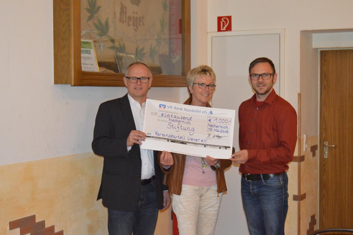 Im Rahmen der diesjährigen Jahreshauptversammlung des Vereinskartells Weyer überreichten die Weyerer Vereine der Mechernich Stiftung eine Spende in Höhe von 1.000,- Euro. Der Versammlungsleiter Björn Wassong begrüßte zu Beginn der Versammlung, zu der alle Vertreter der Mitgliedsvereine eingeladen waren, zunächst die stellvertretende Vorsitzende der Mechernich Stiftung Maria Jentgen und den Vorsitzender der Stiftung Ralf Claßen an welche er im Anschluss auch den symbolischen Scheck über 1.000,- Euro überreichte. Durch einen Spendenaufruf im Rahmen der Renovierung des örtlichen Markuskapellchens im Ort Weyer konnte man im Jahr 2015 mehr Spenden generieren, als zur Renovierung des Markushäuschens benötigt wurden. Da sich auch alle Vereine des Vereinskartells am Spendenaufruf des Ortsvorstehers beteiligten, musste man sich entscheiden was mit dem Geld geschehen sollte. „Auch wenn wir Vereine auch jeden Cent brauchen können, so war schnell klar, dass es im Stadtgebiet Mechernich leider einige Menschen gibt, die dieses Geld dringender brauchen können!“ berichtete Wassong. „Daher waren wir uns schnell darüber einig den Überschuss der Spendensammlung und eine weitere Aufstockung des Betrages durch das Vereinskartell der Mechernich Stiftung zu spenden!“ Die Stiftung, so Wassong, leiste vor allen Dingen bei uns vor Ort im Stadtgebiet Mechernich wichtige und gute Arbeit, die es zu Unterstützen gelte. Sowohl Maria Jentgen, als auch Ralf Claßen bedanken sich sehr herzlich bei den Vertretern des Vereinskartells und erläuterten kurz den Zweck und die Gründung der Mechernich Stiftung. Dabei legten Sie besonderen Wert darauf zu berichten, dass die Stiftung ganz ohne Personalkosten auskäme und dass jeder Unterstützungsfall einzeln und unabhängig geprüft werde. Besonders erläuterten beide, dass es zu keinen Barleistungen kommt, sondern ausschließlich Sachleitungen ausgegeben werden. Mit der Spende des Weyerer Vereinskartells könne man weiter gute Arbeit in Mitten unserer Gesellschaft leisten.