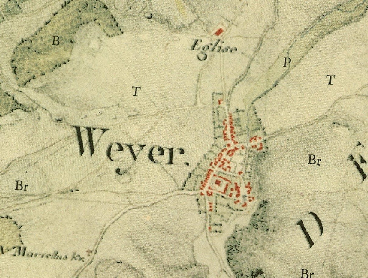 Ein Ausschnitt aus der „Tranchot-Karte“ von 1815, auf der die Kirche („Eglise“) noch weiter vom Ort entfernt auf dem Kirchberg thront, als heute. Auch die Umrisse der Burg im Ort sind noch zu erkennen und sogar das Markushäuschen am Kreuzweg (am linken unteren Bildrand „Marcellus Kr“).