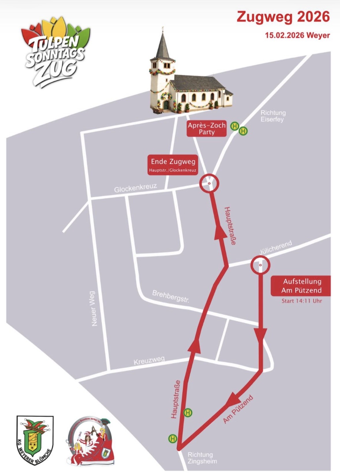In diesem Jahr gibt es auch eine besondere Neuerung: Nach Abschluss der Bauarbeiten präsentiert sich der neue Zugweg. Gestartet wird am Pützend, von dort aus schlängelt sich der bunte Lindwurm die Hauptstraße hinunter bis zum Kirchenweg. Ein frisches Kapitel für unseren traditionsreichen Zug – und ihr seid mittendrin!